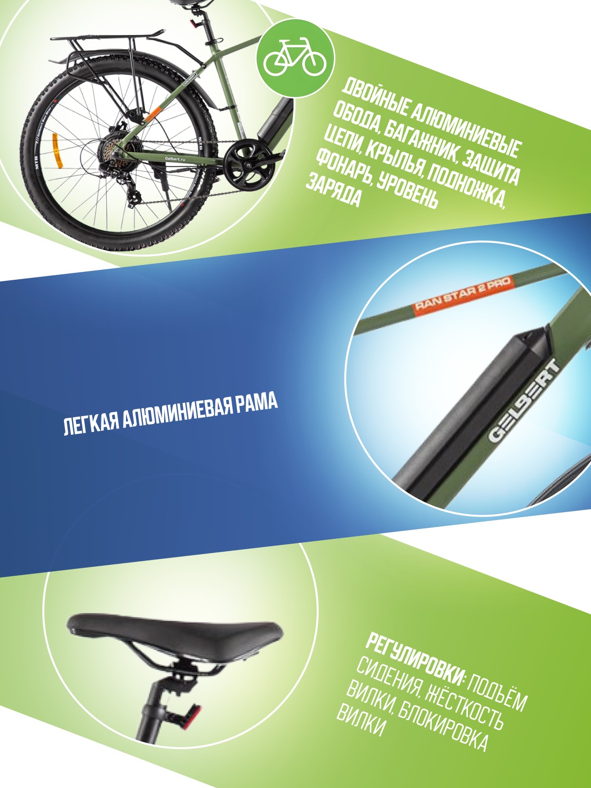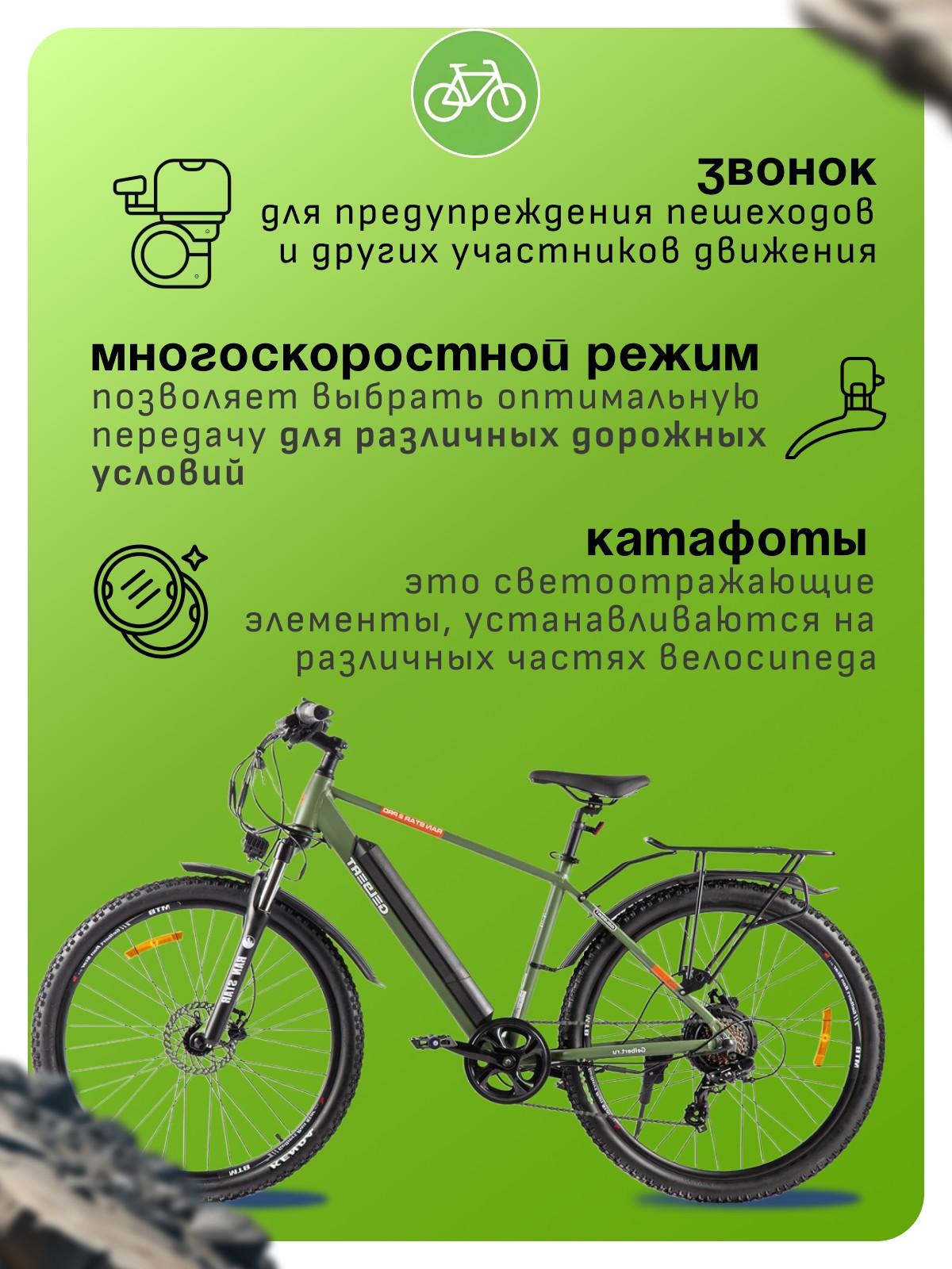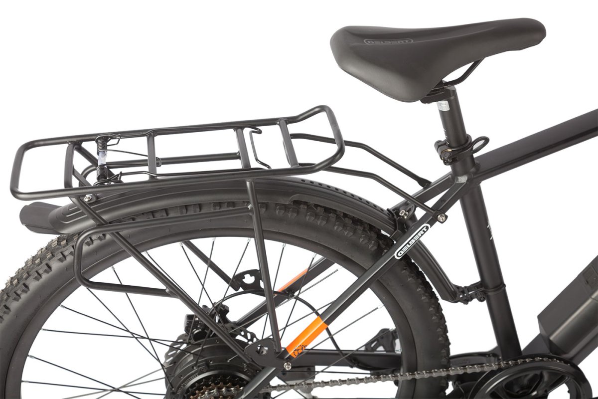 Особенности велосипеда: Алюминиевая рама, Амортизационная вилка, Багажник, Гидравлический привод тормозов, Двойные обода, Дисковые тормоза, Защита цепи, Звонок, Катафоты, Крылья, Многоскоростной, Подножка, Уровень заряда, Фонарь.