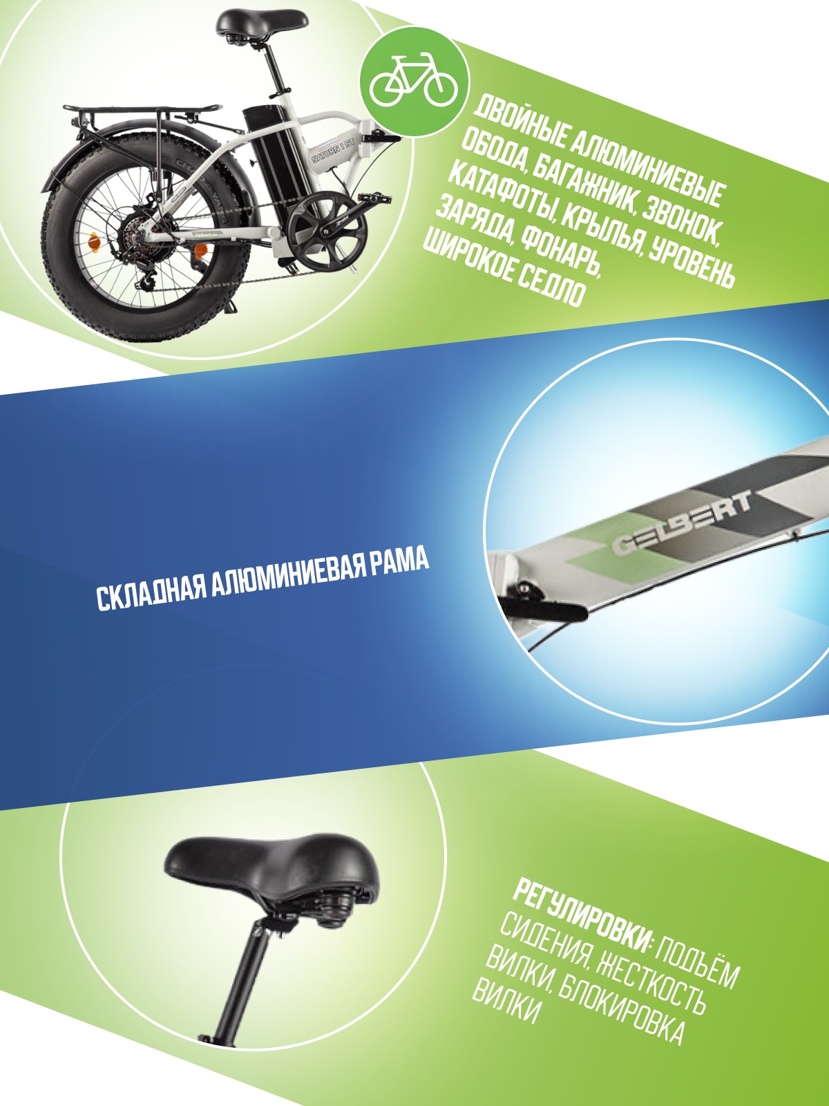Особенности велосипеда: Алюминиевая рама, Амортизационная вилка, Багажник, Гидроформинг рамы, Двойные обода, Дисковые тормоза, Звонок, Крылья, Многоскоростной, Подножка, Фонарь, Широкое седло, Катафоты, Уровень заряда.