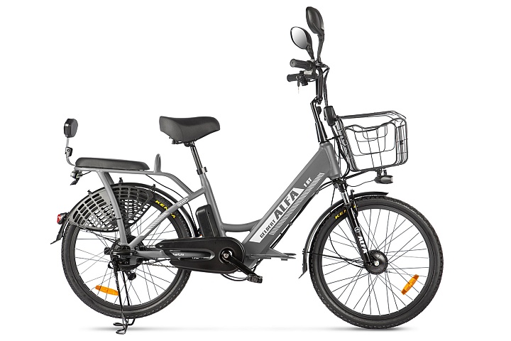 Комфортабельный электровелосипед без переключения передач. Подходит для прогулочного катания в городских условиях и по несложным маршрутам в лесу. Диаметр колес - 24 дюйма. Вес - 34 кг. Грузоподъемность - до 110 кг. Пробег на одной зарядке - до 30 км. Максимальная скорость - до 25 км/ч. Технические особенности: алюминиевая рама (Hardtail, интегрированный багажник), амортизационная вилка пружинного типа, двойные алюминиевые обода (под ниппель AV), надежные барабанные тормоза, редукторный мотор мощностью 250 Вт, литий-ионная батарея емкостью 10.4 Ah, защита цепи, длинные металлические крылья, задний багажник с сиденьем и спинкой, комфортное седло, передняя корзина, система освещения, центральная подножка, подножки для водителя и пассажира, зеркала заднего вида.
