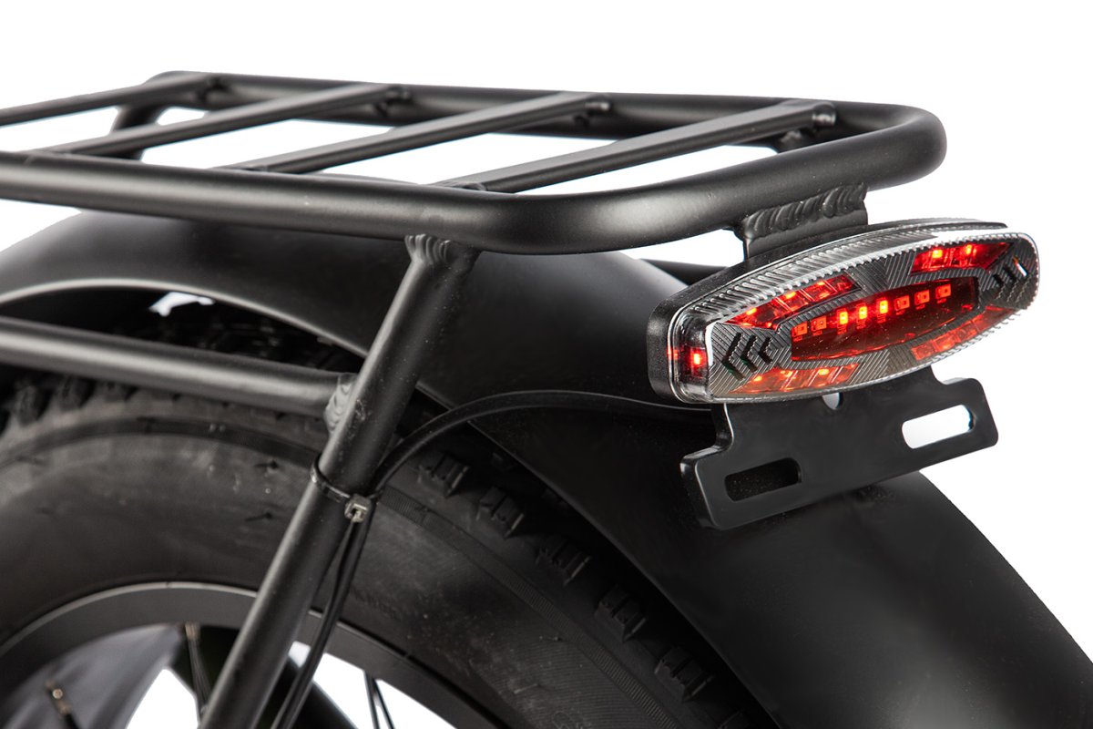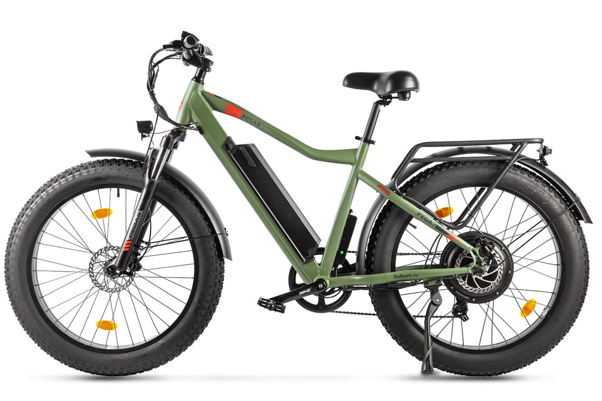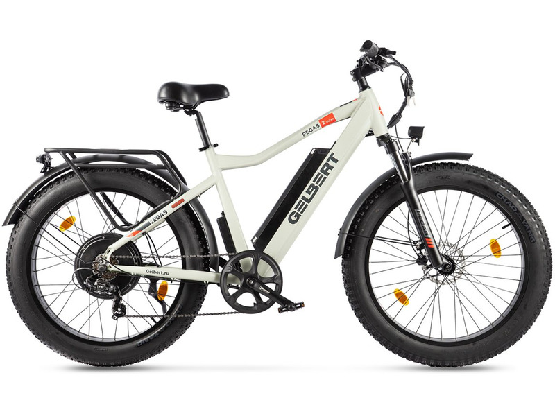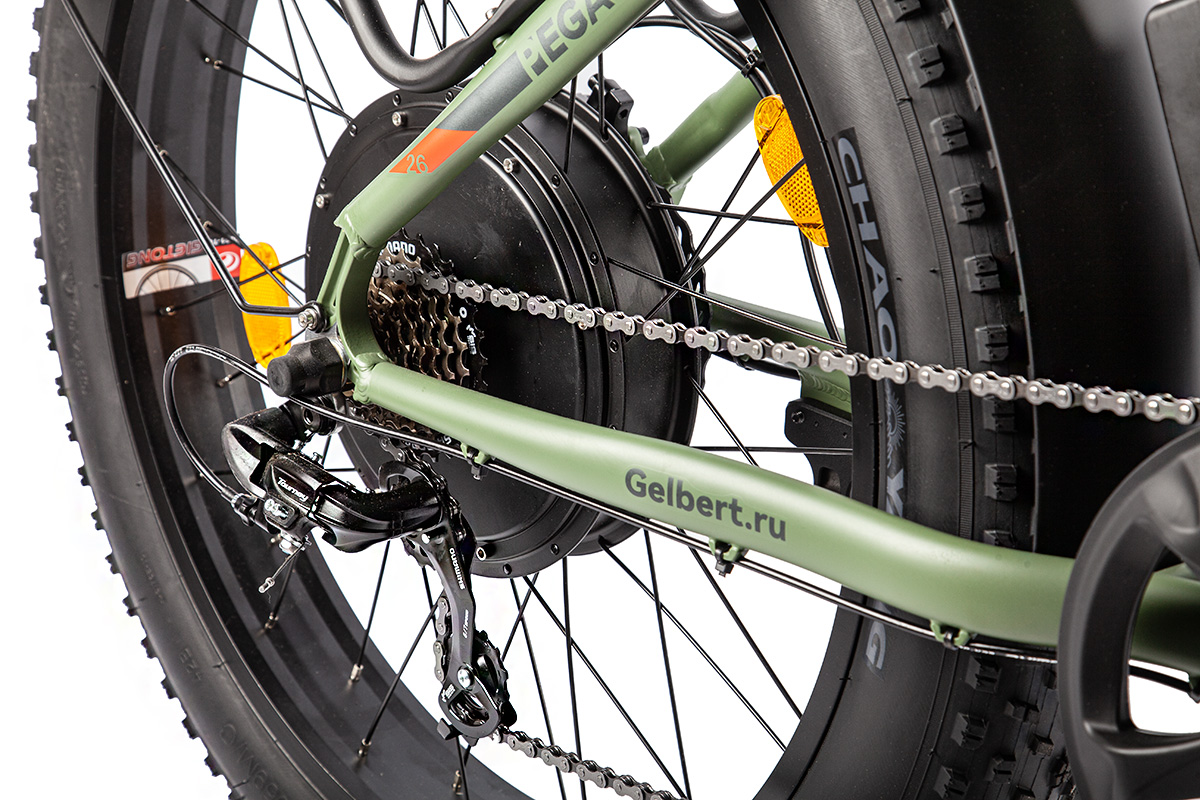 Электровелосипед-фэтбайк с оборудованием начального класса Shimano, 7 скоростей. Технические особенности: легкая алюминиевая рама (кареточный стакан BSA, съемный петух), амортизационная вилка (ход 100 мм, блокировка, регулировка преднагрузки), двойные алюминиевые обода (под AV ниппель), дисковые гидравлические тормоза (роторы 160/160 мм с креплением на 6 болтов), редукторный мотор мощностью 1000 Вт, литий-ионный аккумулятор (48 В / 13 А·ч), цветной ЖК-дисплей, защита цепи, крылья, задний багажник, система освещения. Подходит для активной езды по различным дорогам и пересеченной местности. Максимальная скорость: до 35 км/ч. Пробег на одной зарядке: до 60 км. Грузоподъемность: до 120 кг. Диаметр колес - 26 дюймов. Вес - 35 кг.