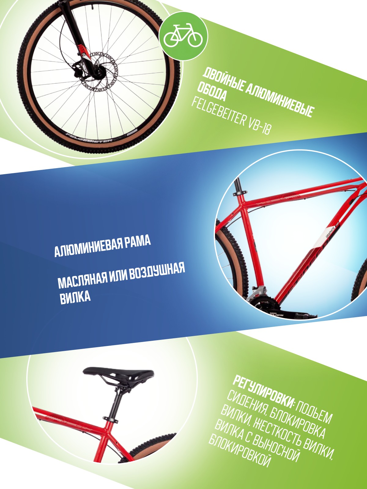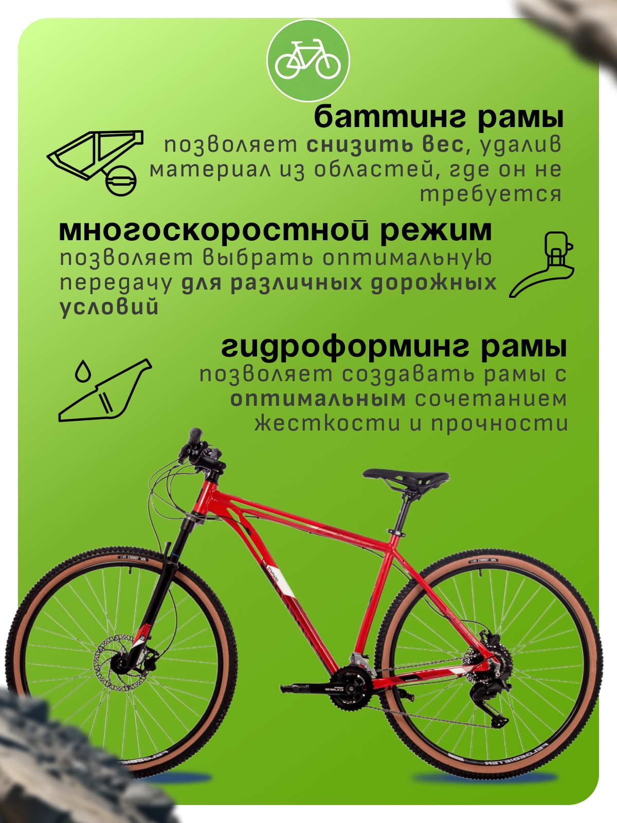 Особенности велосипеда: Алюминиевая рама, Амортизационная вилка, Баттинг рамы, Гидравлический привод тормозов, Гидроформинг рамы, Двойные обода, Дисковые тормоза, Масляная или воздушная вилка, Многоскоростной.