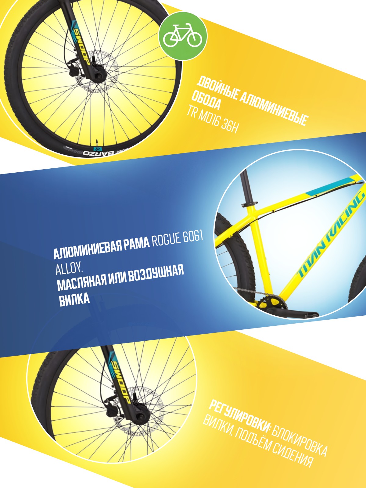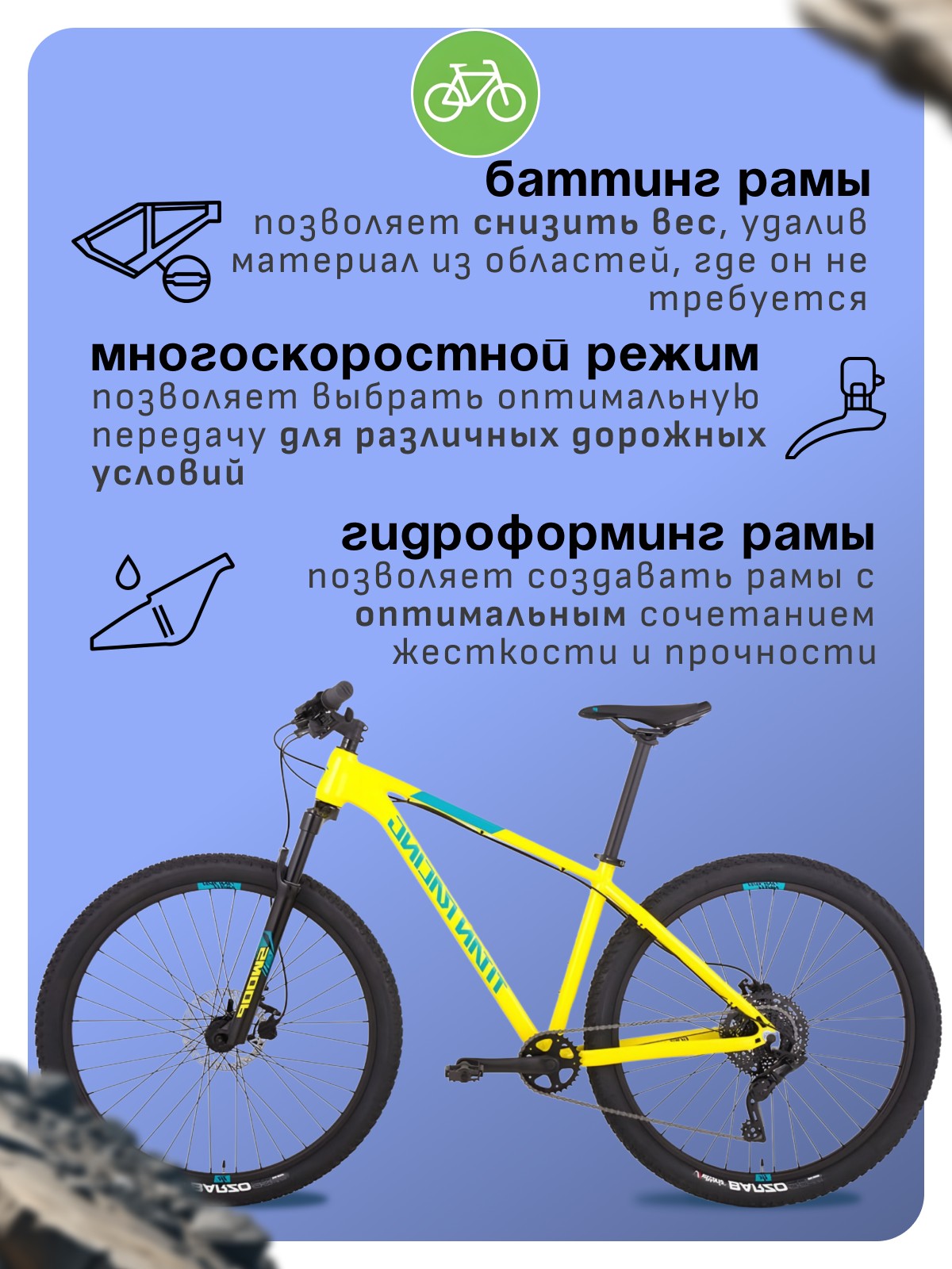 Особенности велосипеда: Алюминиевая рама, Амортизационная вилка, Баттинг рамы, Гидравлический привод тормозов, Двойные обода, Дисковые тормоза, Многоскоростной.