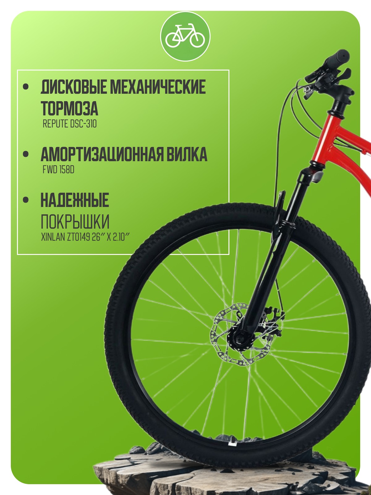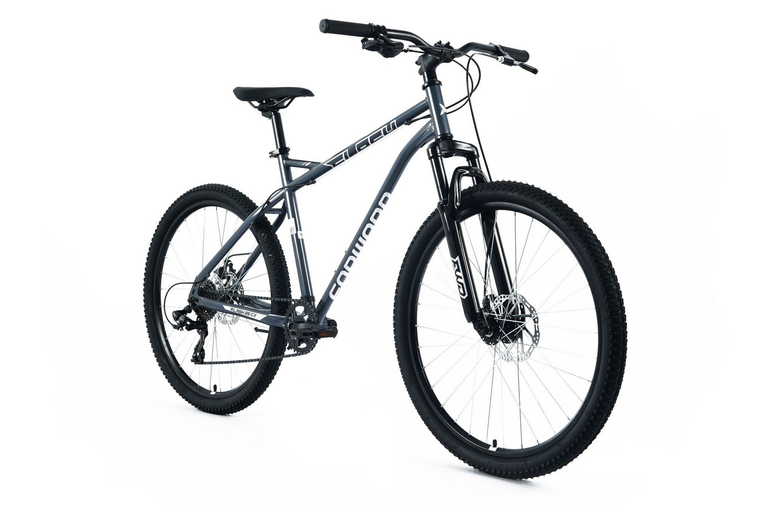Горный велосипед для начинающих с навесным оборудованием Shimano/LTWOO, 8 скоростей. Технические особенности: прочная стальная рама (открытая прокладка тросов, кареточный стакан BSA, крепление калипера IS, интегрированный петух, бонки для багажника и флягодержателя), амортизационная вилка FWD 158D (пружинная, стальная, ход 80 мм, крепление калипера IS), двойные алюминиевые обода FWD (под AV ниппель), дисковые механические тормоза Repute DSC-310 (роторы 160/160 мм с креплением на 6 болтов), подножка. Подходит для прогулочного катания в городских условиях и по несложным маршрутам в лесу. Диаметр колес - 26 дюймов. Вес - 17 кг.