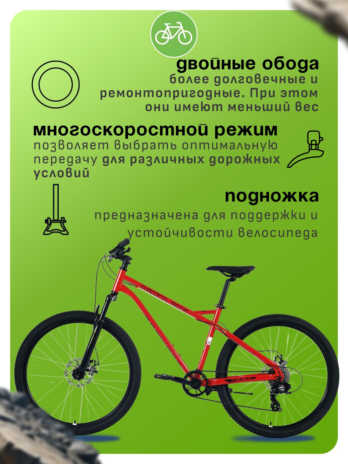Особенности велосипеда: Амортизационная вилка, Двойные обода, Дисковые тормоза, Многоскоростной, Подножка.