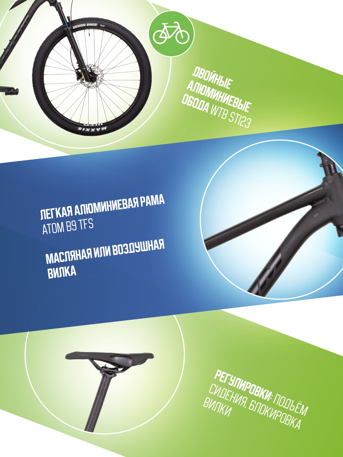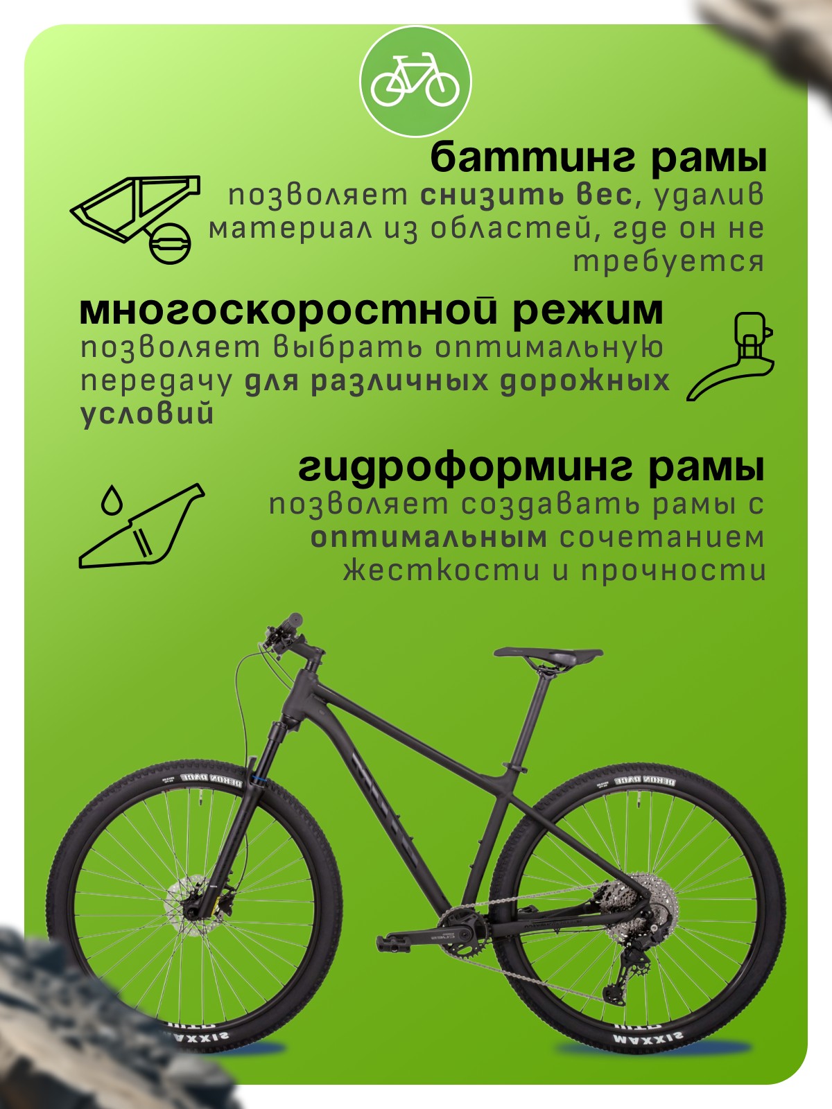 Особенности велосипеда: Алюминиевая рама, Гидравлический привод тормозов, Двойные обода, Дисковые тормоза, Многоскоростной, Амортизационная вилка, Баттинг рамы, Гидроформинг рамы, Масляная или воздушная вилка.