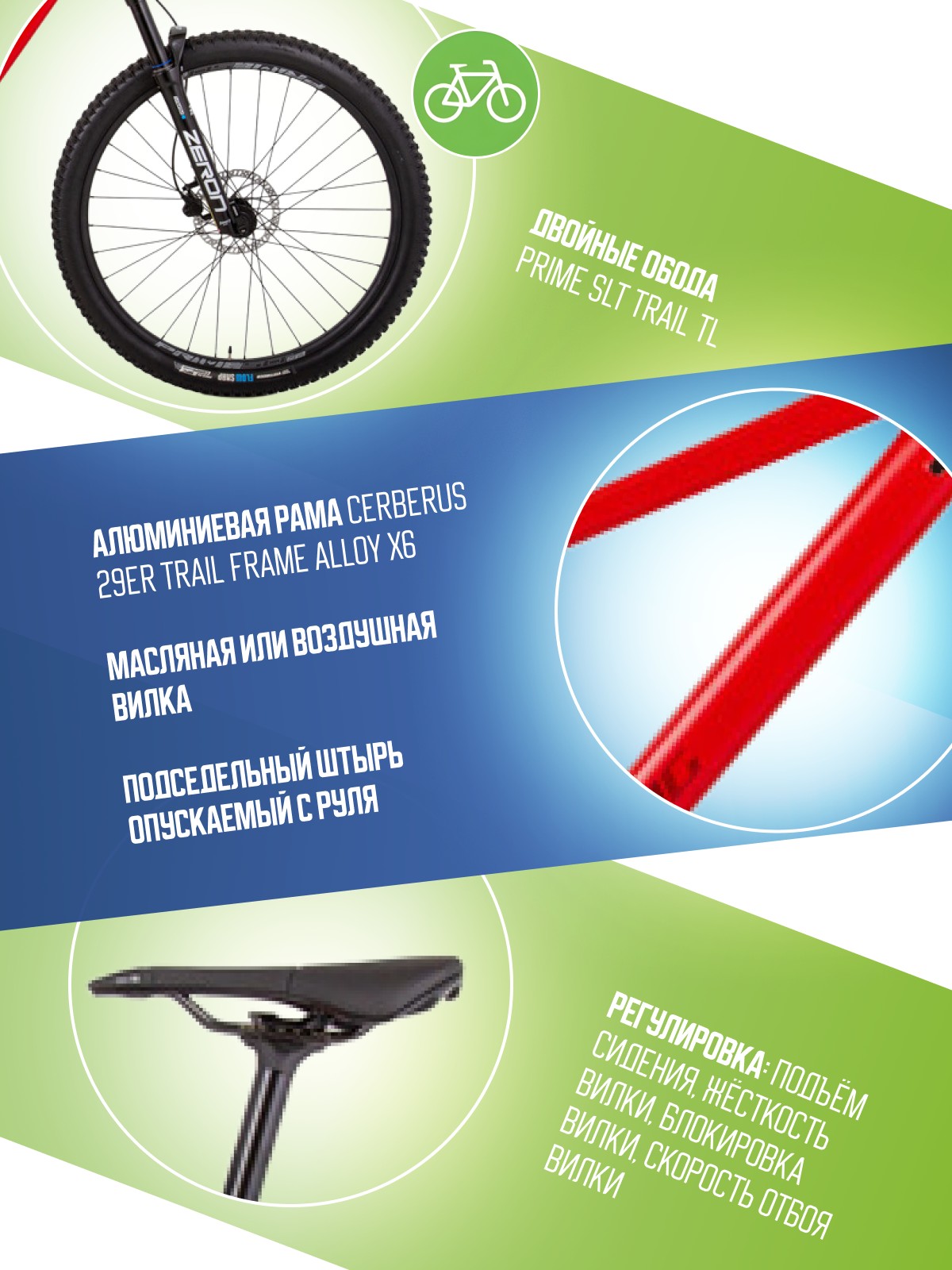 Хардтейл для езды в стиле кросс-кантри и трейл с оборудованием предпрофессионального класса Microshift, 10 скоростей. Технические особенности: алюминиевая рама Cerberus 29er Trail Frame Alloy X6 (баттинг, гидроформинг, внутренняя проводка, дропауты под полую ось), амортизационная вилка Suntour Zeron35 (масляно-воздушная, ход 130 мм), двойные обода Prime SLT Trail TL, дисковые гидравлические тормоза Tektro HD-M275. Подходит для активного катания по пересеченной местности и в стиле трейл. Диаметр колес - 29 дюймов. Вес - 14,2 кг.