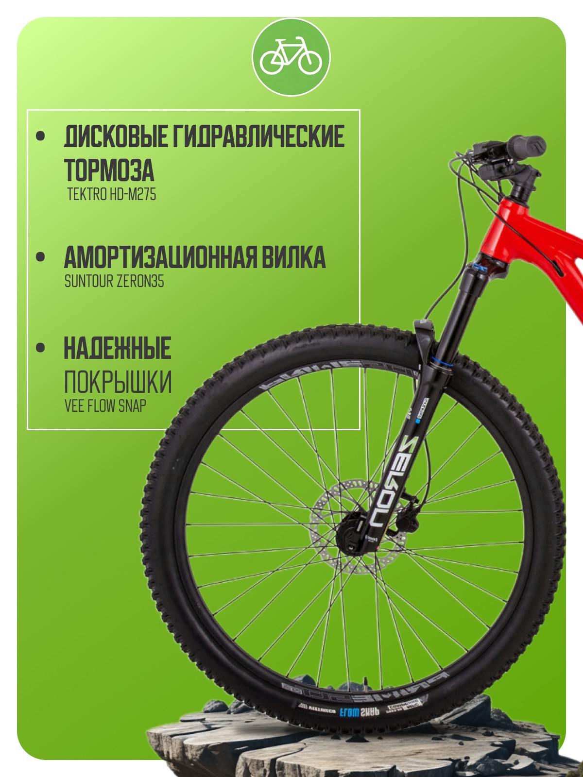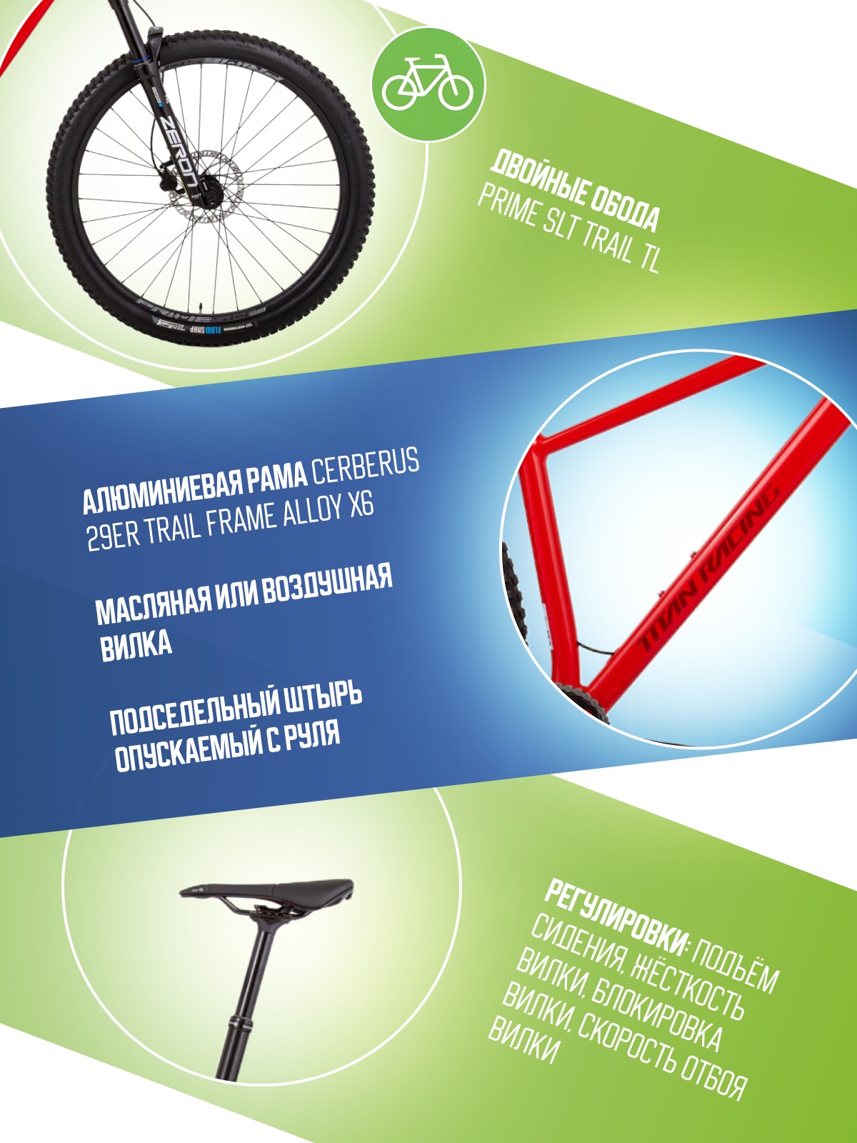 Регулировки и настройки: Блокировка вилки, Жесткость вилки, Подьем сидения, Скорость отбоя вилки.