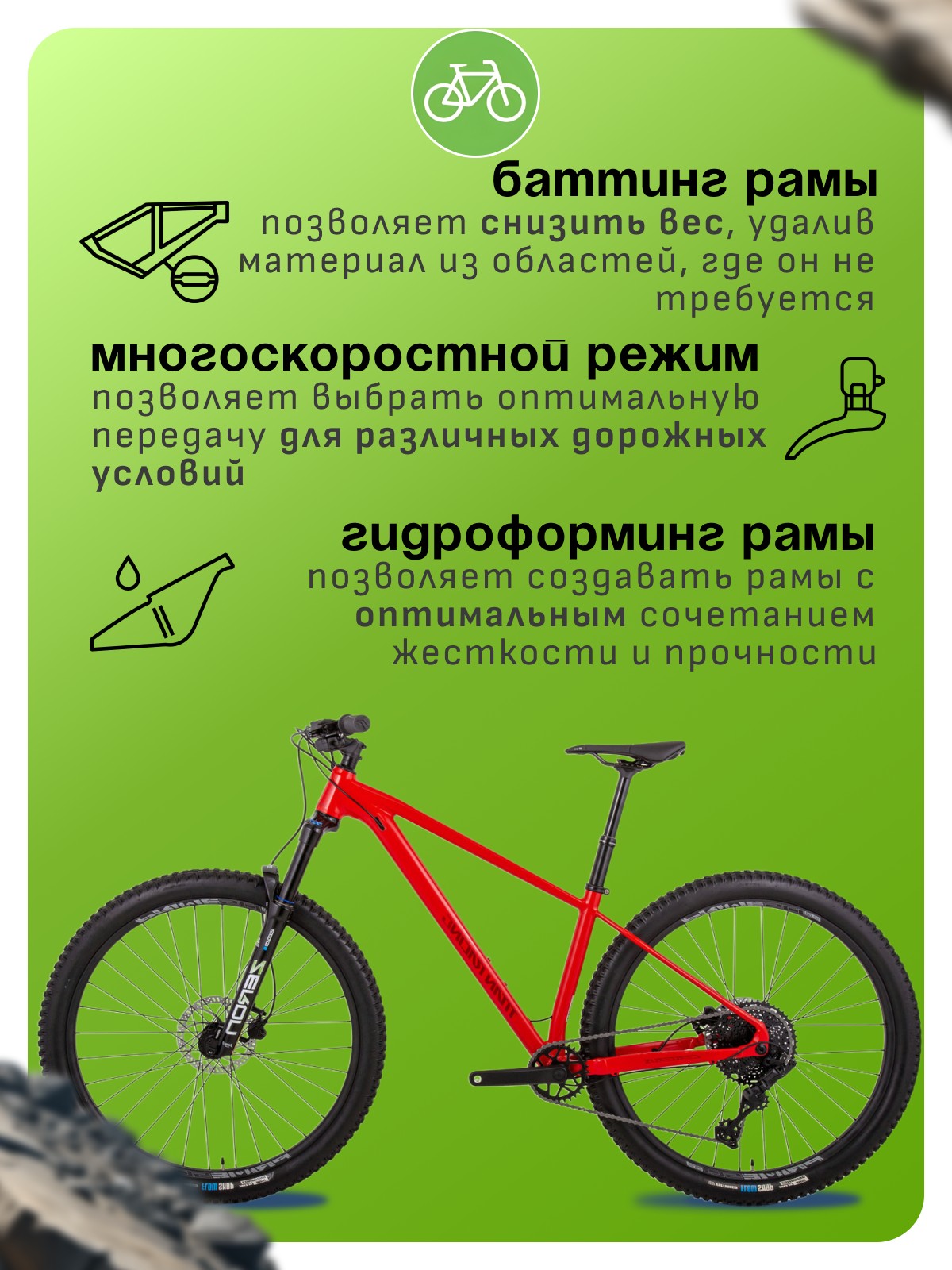 Особенности велосипеда: Алюминиевая рама, Амортизационная вилка, Баттинг рамы, Гидравлический привод тормозов, Гидроформинг рамы, Двойные обода, Дисковые тормоза, Масляная или воздушная вилка, Многоскоростной, Подседельный штырь опускаемый с руля.