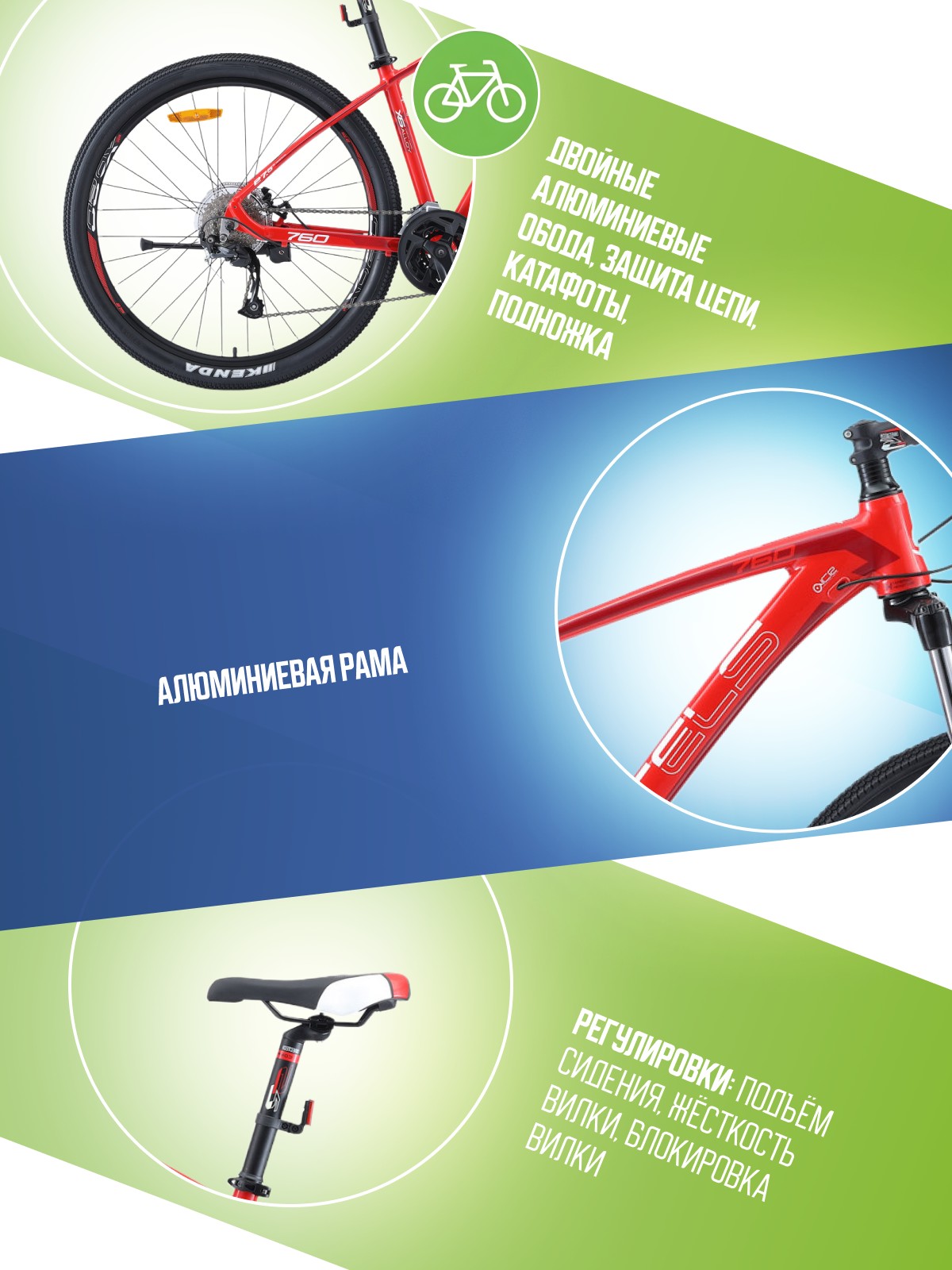 Особенности велосипеда: Алюминиевая рама, Амортизационная вилка, Баттинг рамы, Гидроформинг рамы, Двойные обода, Дисковые тормоза, Защита цепи, Катафоты, Многоскоростной, Подножка.