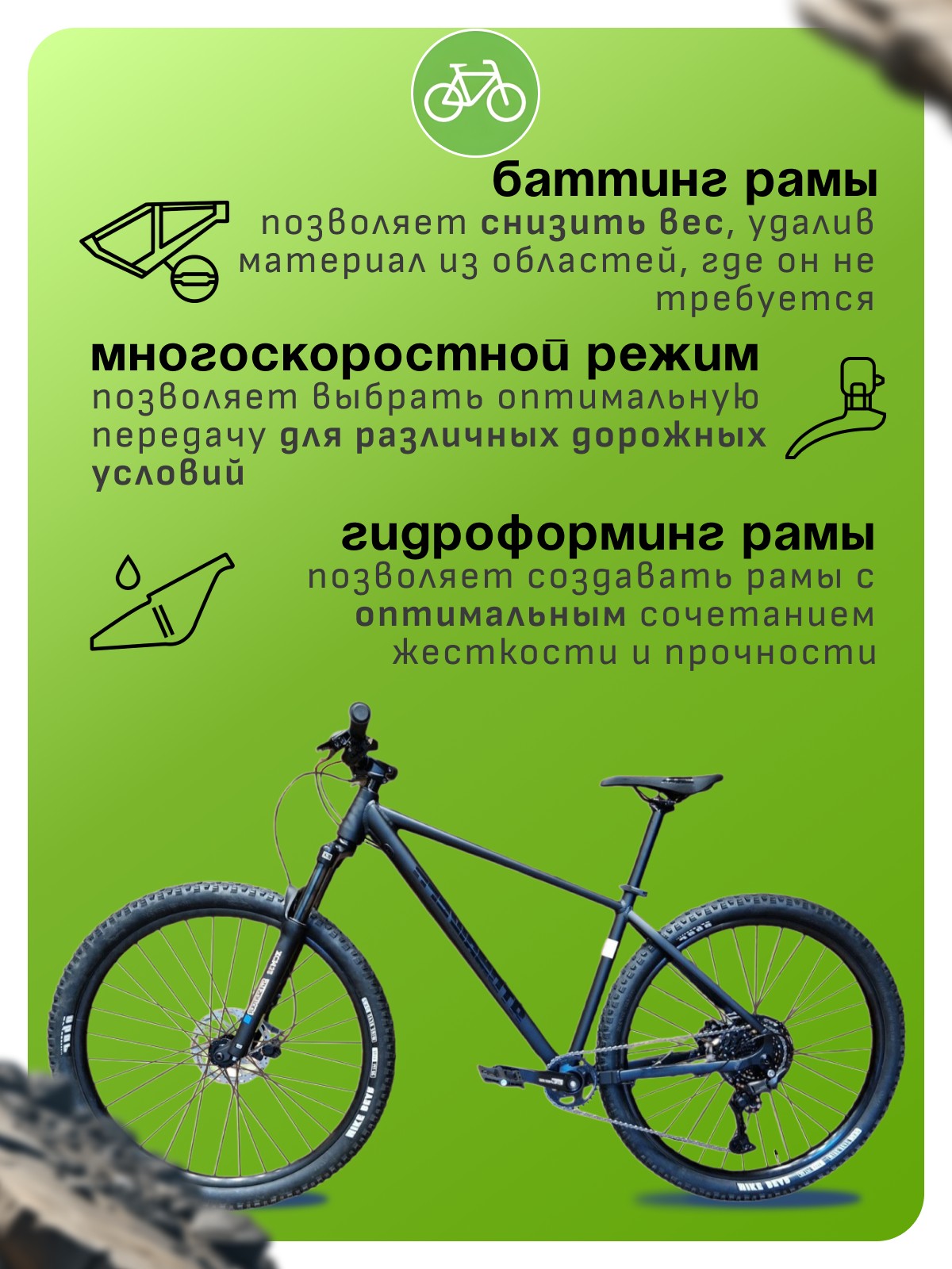 Особенности велосипеда: Алюминиевая рама, Амортизационная вилка, Баттинг рамы, Гидравлический привод тормозов, Двойные обода, Дисковые тормоза, Многоскоростной, Гидроформинг рамы.