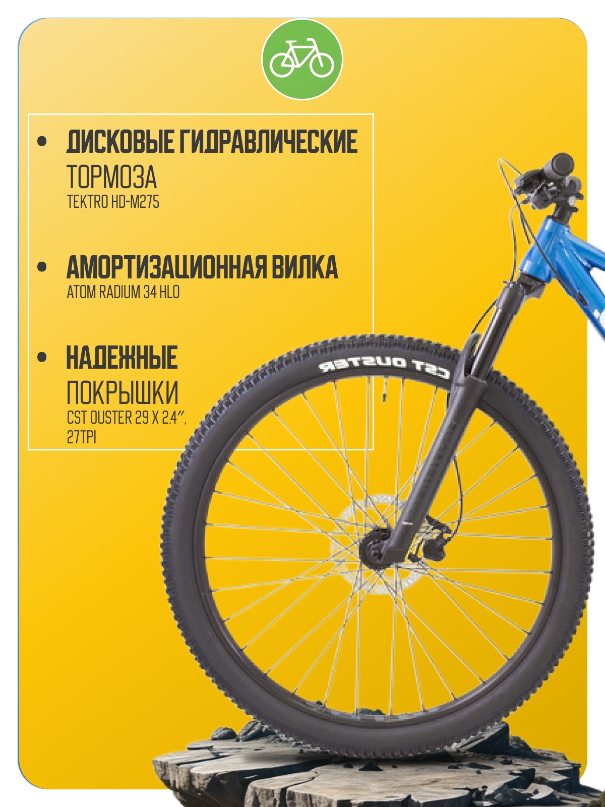 Горный велосипед с навесным оборудованием предпрофессионального класса Shimano, 11 скоростей. Технические особенности: алюминиевая рама Alloy 6061-T6 Triple Butted (тройной баттинг, внутренняя проводка, дропауты под полую ось), амортизационная вилка ATOM Radium 34 HLO (масляно-пружинная, ход 120 мм, гидравлическая блокировка), двойные алюминиевые обода WTB STX i30, дисковые гидравлические тормоза Tektro HD-M275 (роторы Tektro TR-24 180/180 мм). Подходит для активного катания в стиле трейл и кросс-кантри. Диаметр колес - 29 дюймов. Вес - 14,9 кг.