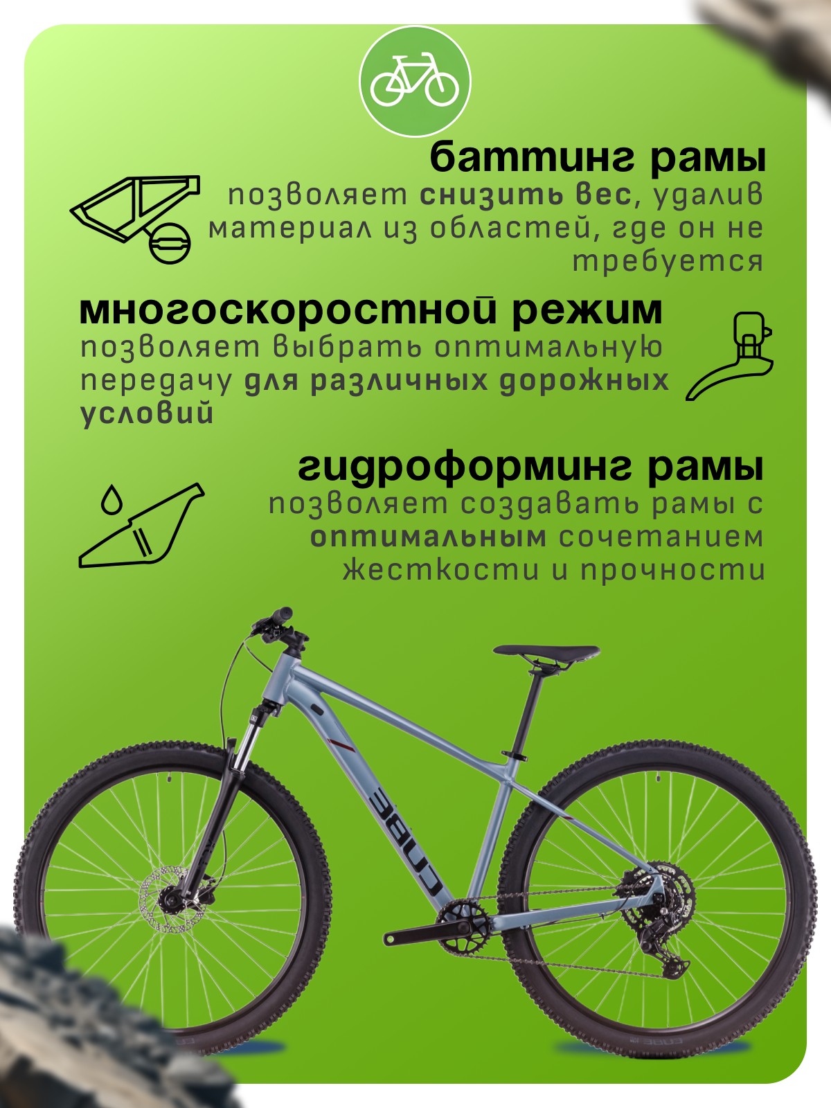 Особенности велосипеда: Алюминиевая рама, Амортизационная вилка, Баттинг рамы, Гидравлический привод тормозов, Гидроформинг рамы, Двойные обода, Дисковые тормоза, Многоскоростной.