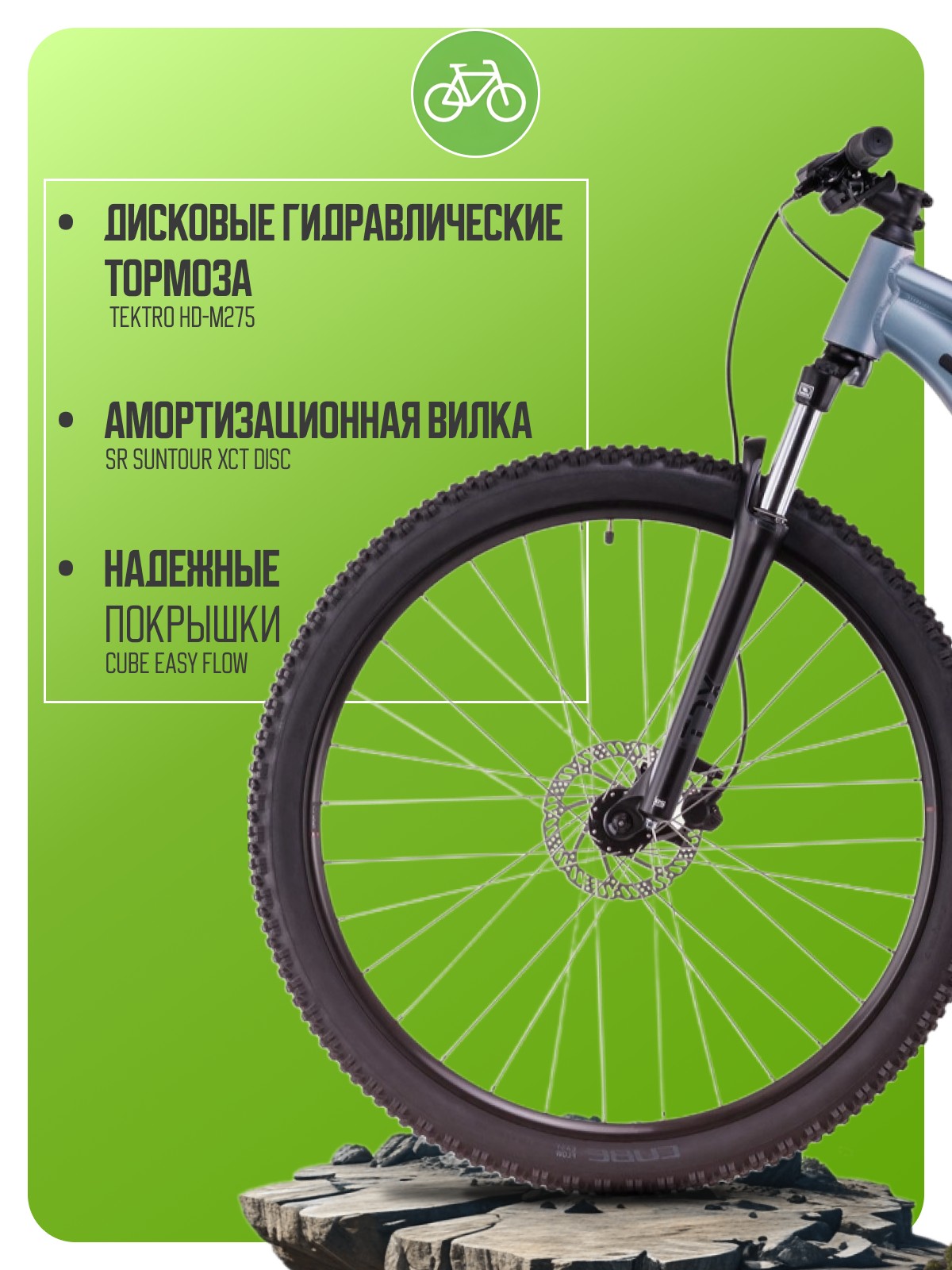 Легкий хардтейл для езды в стиле кросс-кантри с оборудованием высшего любительского класса Shimano, 9 скоростей. Технические особенности: алюминиевая рама Aluminium Lite (двойной баттинг, гидроформинг, скрытая проводка, сглаженные швы, крепление для подножки), амортизационная вилка SR Suntour XCT Disc (пружинно-эластомерная, регулировка преднагрузки, ход 100 мм), двойные алюминиевые обода CUBE EX25, дисковые гидравлические тормоза Tektro HD-M275 (роторы 160/160 мм). Подходит для активной езды по различным дорогам и пересеченной местности. Диаметр колес - 27,5 дюймов. Вес - 14,3 кг.