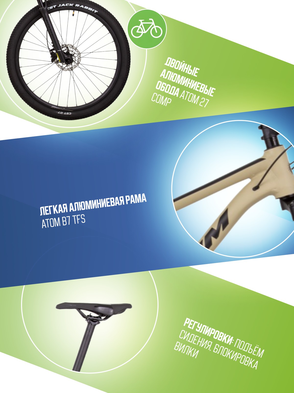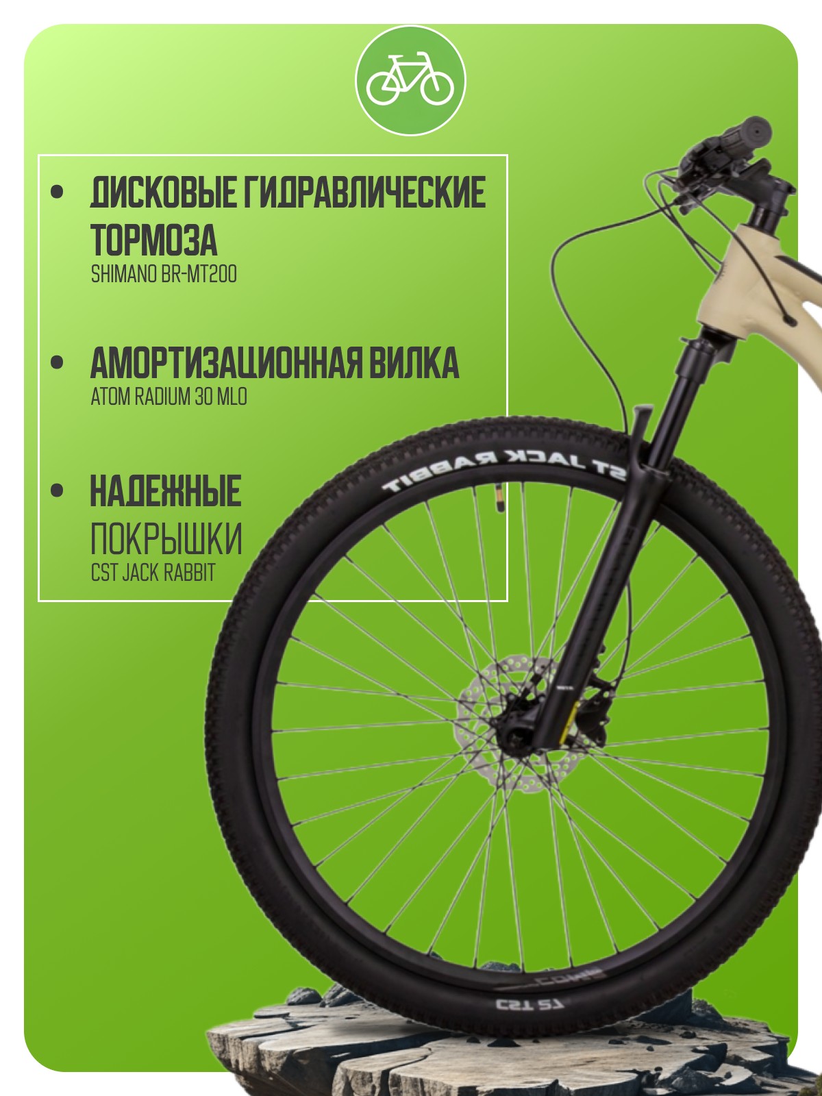 Облегченный хардтейл для кросс-кантри с оборудованием любительского класса Shimano, 16 скоростей. Технические особенности: легкая алюминиевая рама ATOM B7 TFS (тройной баттинг, скрытая проводка, конический рулевой стакан), амортизационная вилка ATOM Radium 30 MLO (пружинно-эластомерная, механическая блокировка, ход 100 мм), двойные алюминиевые обода ATOM 27 Comp, дисковые гидравлические тормоза Shimano BR-MT200 (роторы Shimano SM-RT10-S Centerlock 160/160 мм). Подходит для активного катания в стиле кросс-кантри. Диаметр колес - 27,5 дюймов. Вес - 13,5 кг.