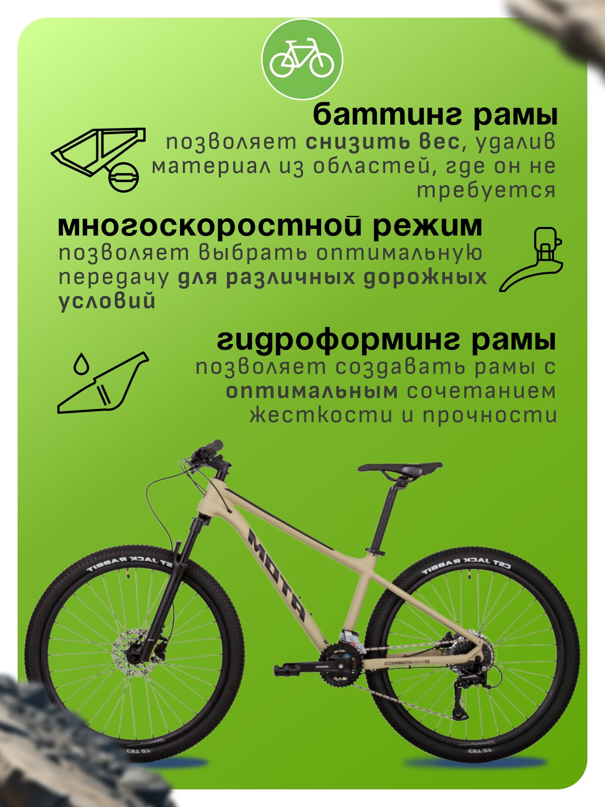 Особенности велосипеда: Алюминиевая рама, Гидравлический привод тормозов, Двойные обода, Дисковые тормоза, Многоскоростной, Амортизационная вилка, Баттинг рамы, Гидроформинг рамы.