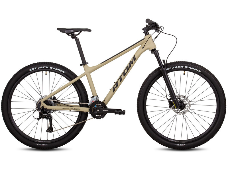 Облегченный хардтейл для кросс-кантри с оборудованием любительского класса Shimano, 16 скоростей. Технические особенности: легкая алюминиевая рама ATOM B7 TFS (тройной баттинг, скрытая проводка, конический рулевой стакан), амортизационная вилка ATOM Radium 30 MLO (пружинно-эластомерная, механическая блокировка, ход 100 мм), двойные алюминиевые обода ATOM 27 Comp, дисковые гидравлические тормоза Shimano BR-MT200 (роторы Shimano SM-RT10-S Centerlock 160/160 мм). Подходит для активного катания в стиле кросс-кантри. Диаметр колес - 27,5 дюймов. Вес - 13,5 кг.