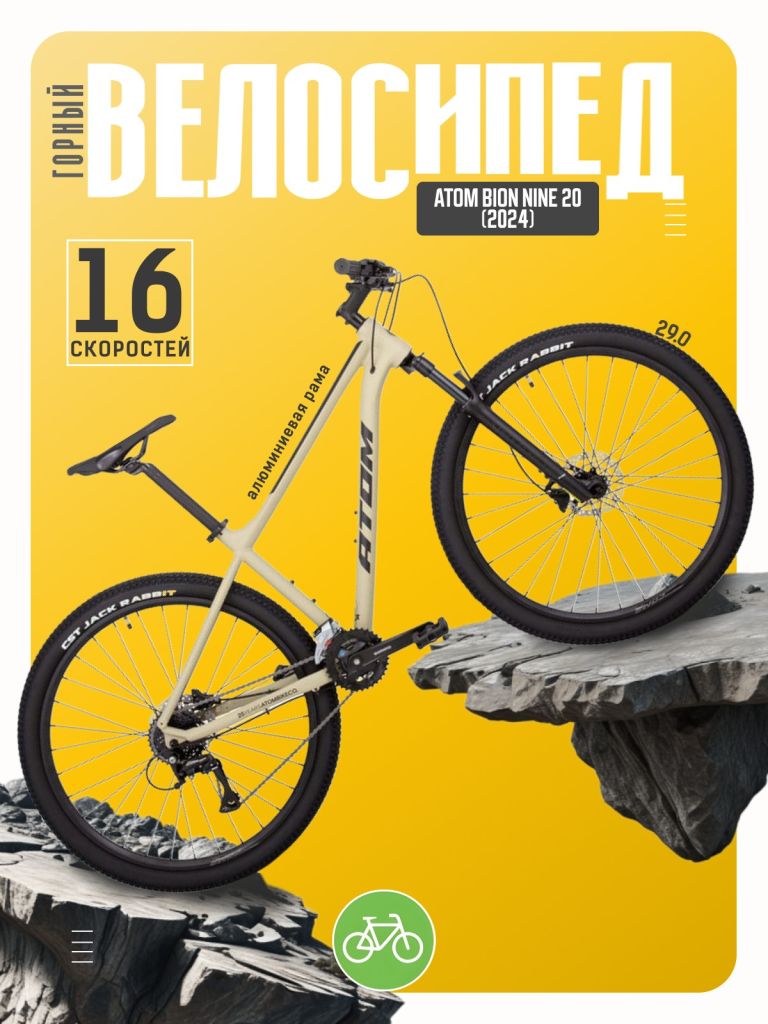 Горный велосипед оборудованием предпрофессионального класса Shimano, 16 скоростей. Технические особенности: алюминиевая рама ATOM B9 TFS (тройной баттинг, внутренняя проводка), амортизационная вилка ATOM RADIUM 30 MLO (ход 100 мм), двойные алюминиевые обода ATOM 29 Comp, дисковые гидравлические тормоза Shimano BR-MT200. Подходит для активного катания в стиле трейл и кросс-кантри. Диаметр колес - 29 дюймов. Вес - 14.2 кг.