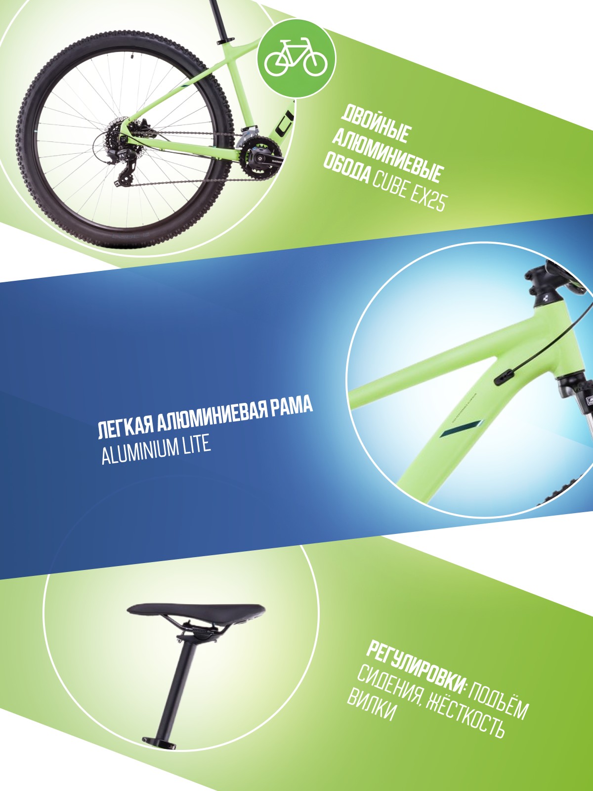 Горный велосипед с оборудованием начального любительского класса Shimano, 16 скоростей. Технические особенности: легкая алюминиевая рама Aluminium Lite (гидроформинг, двойной баттинг, скрытая проводка, крепление для подножки), амортизированная вилка SR Suntour XCE (пружинно-эластомерная, ход 100 мм), двойные алюминиевые обода CUBE ZX20, дисковые гидравлические тормоза Clarks Clout 1 (роторы 160/160 мм). Подходит для активной езды по различным дорогам и пересеченной местности. Диаметр колес - 27,5 дюймов. Вес - 14,5 кг.