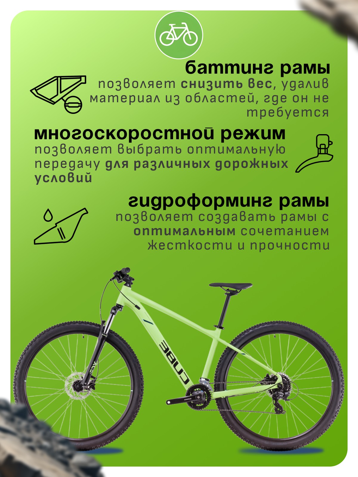 Особенности велосипеда: Алюминиевая рама, Амортизационная вилка, Баттинг рамы, Гидравлический привод тормозов, Гидроформинг рамы, Двойные обода, Дисковые тормоза, Многоскоростной.