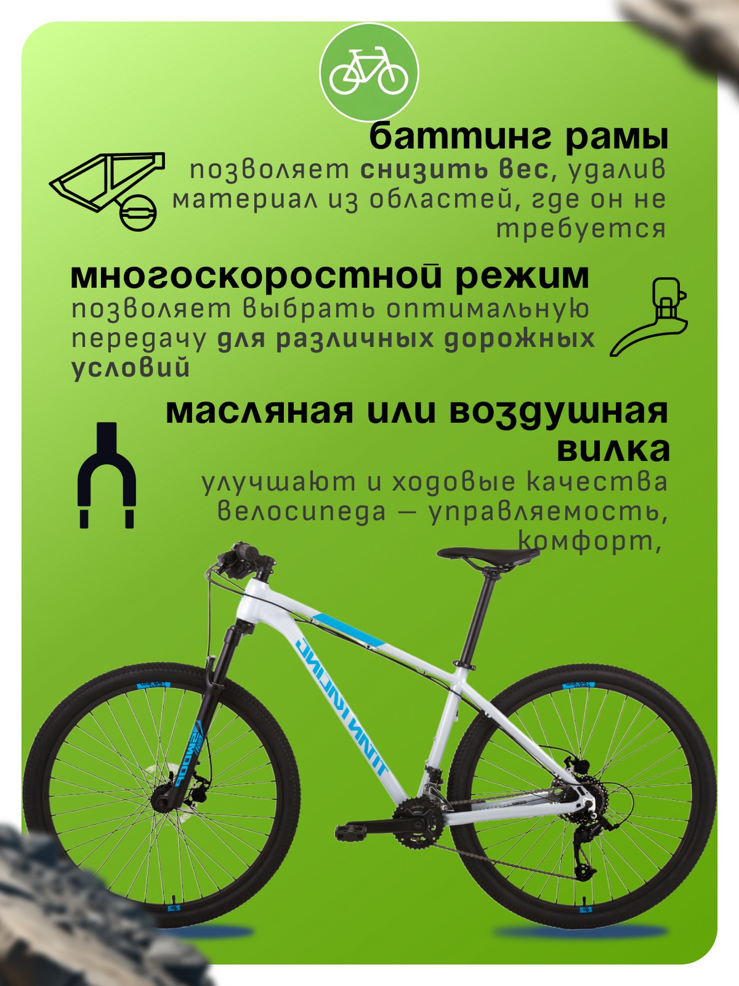 Особенности велосипеда: Алюминиевая рама, Амортизационная вилка, Баттинг рамы, Гидравлический привод тормозов, Двойные обода, Дисковые тормоза, Многоскоростной.