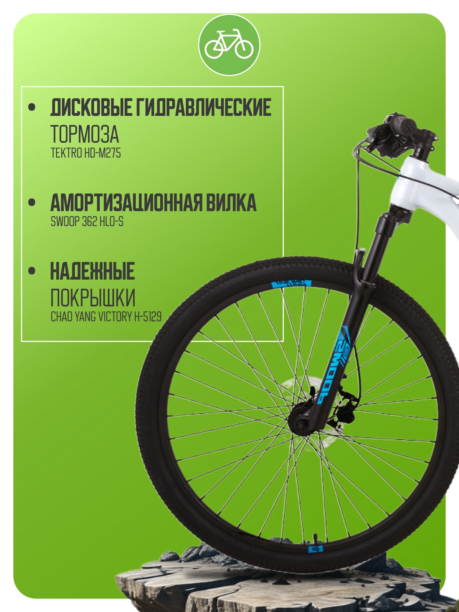 Горный велосипед с оборудованием начального любительского класса Microshift, 16 скоростей. Технические особенности: алюминиевая рама Rogue 6061 Alloy, амортизационная вилка SWOOP 362 HLO-S (ход 100 мм), двойные алюминиевые обода TR MD16, дисковые гидравлические тормоза Tektro HD-M275. Подходит для активной езды по различным дорогам и пересеченной местности. Диаметр колес - 29 дюймов. Вес - 14,9 кг.