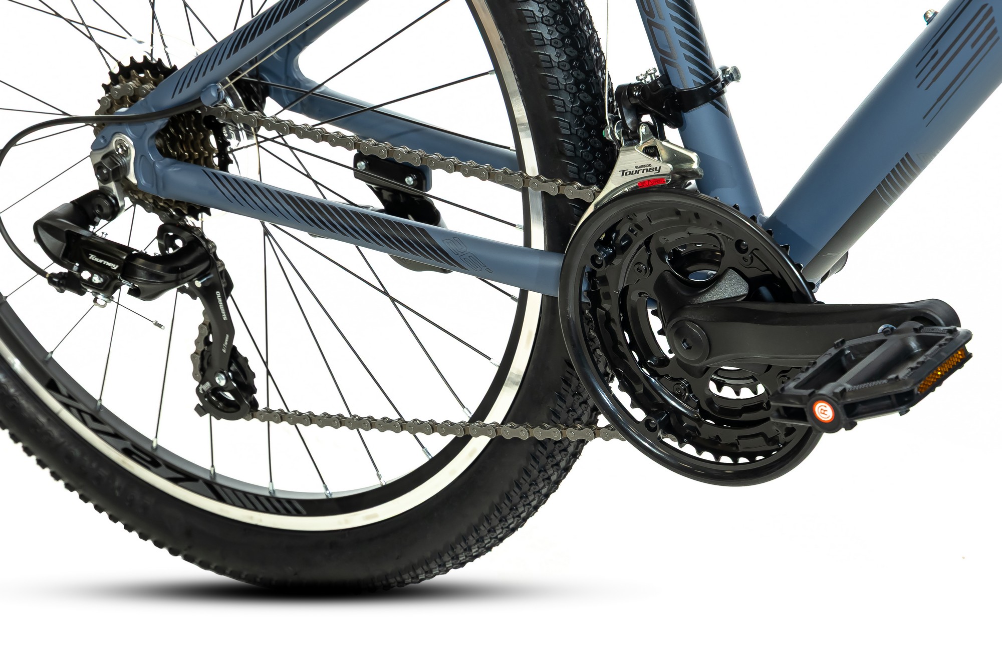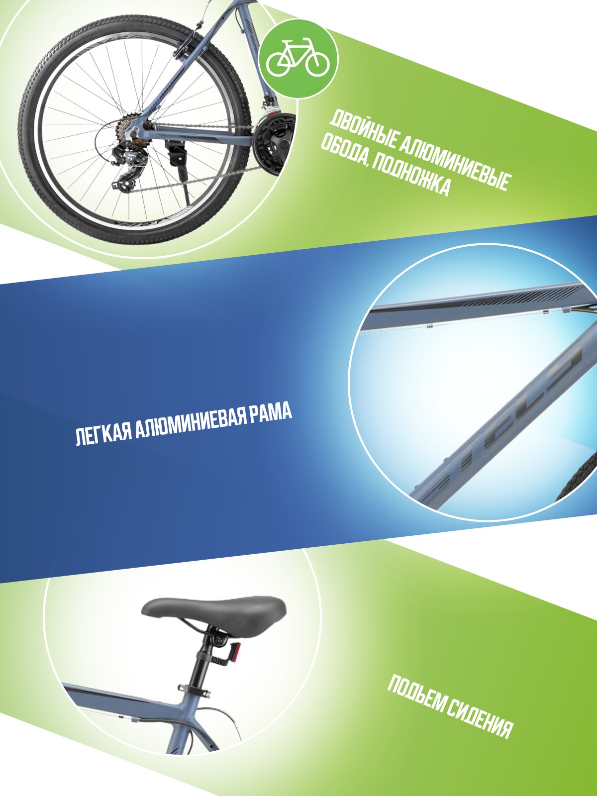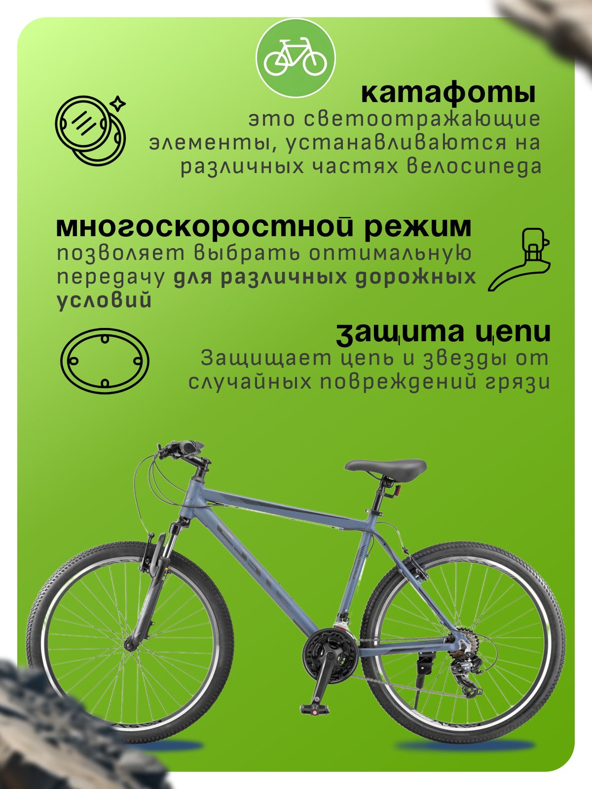Особенности велосипеда: Алюминиевая рама, Амортизационная вилка, Двойные обода, Защита цепи, Катафоты, Многоскоростной, Подножка.