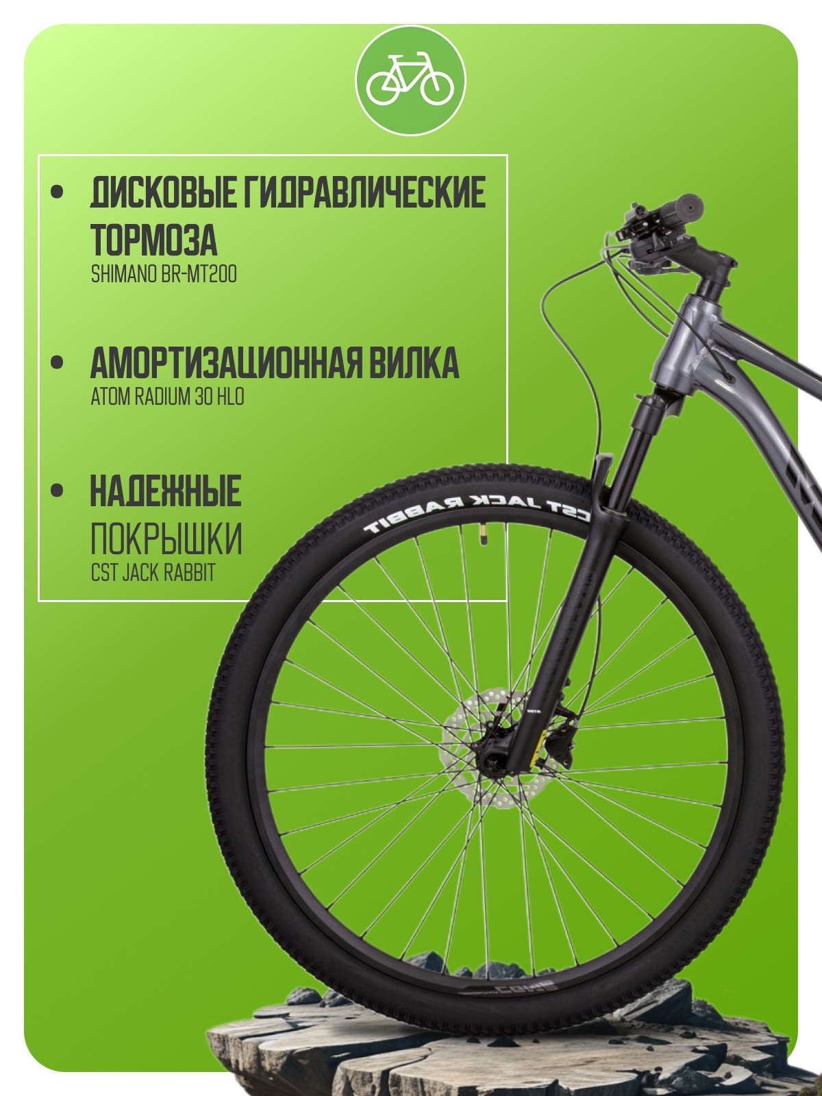 Облегченный хардтейл для кросс-кантри с оборудованием высшего любительского класса Shimano, 18 скоростей. Технические особенности: легкая алюминиевая рама ATOM B9 TFS (тройной баттинг, скрытая проводка, конический рулевой стакан), амортизационная вилка ATOM Radium 30 HLO (пружинно-масляная, гидравлическая блокировка, ход 100 мм), двойные алюминиевые обода ATOM 29 Comp, дисковые гидравлические тормоза Shimano BR-MT200 (роторы Shimano SM-RT10-S Centerlock 160/160 мм). Подходит для активного катания в стиле кросс-кантри. Диаметр колес - 29 дюймов. Вес - 13,5 кг.