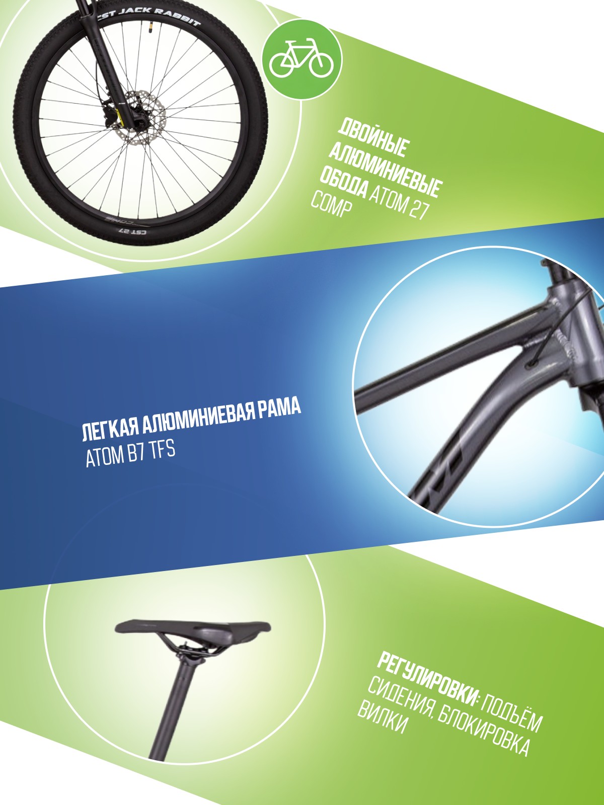 Облегченный хардтейл для кросс-кантри с оборудованием любительского класса Shimano, 16 скоростей. Технические особенности: легкая алюминиевая рама ATOM B7 TFS (тройной баттинг, скрытая проводка, конический рулевой стакан), амортизационная вилка ATOM Radium 30 MLO (пружинно-эластомерная, механическая блокировка, ход 100 мм), двойные алюминиевые обода ATOM 27 Comp, дисковые гидравлические тормоза Shimano BR-MT200 (роторы Shimano SM-RT10-S Centerlock 160/160 мм). Подходит для активного катания в стиле кросс-кантри. Диаметр колес - 27,5 дюймов. Вес - 13,5 кг.