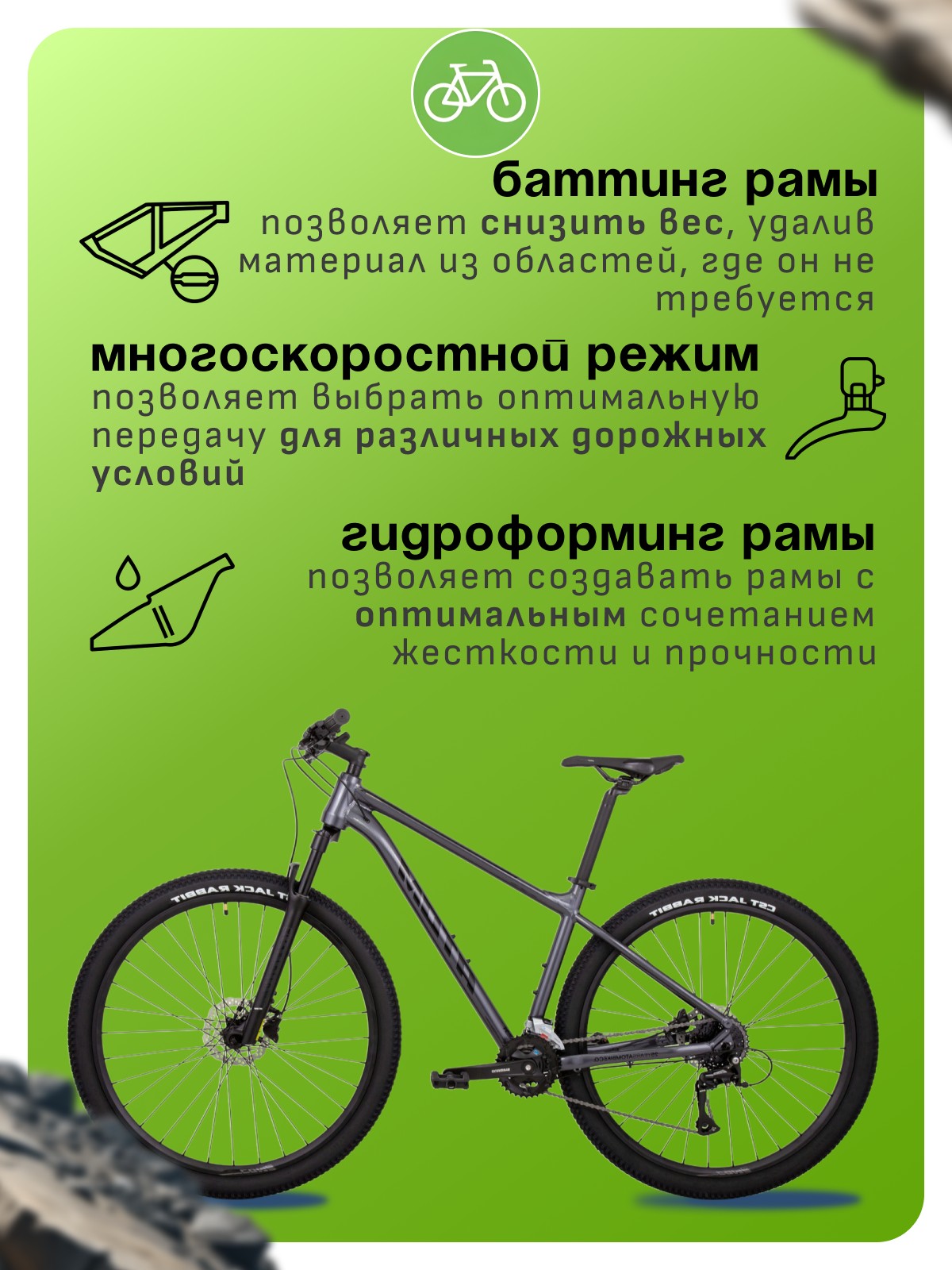 Особенности велосипеда: Алюминиевая рама, Гидравлический привод тормозов, Двойные обода, Дисковые тормоза, Многоскоростной, Амортизационная вилка, Баттинг рамы, Гидроформинг рамы.