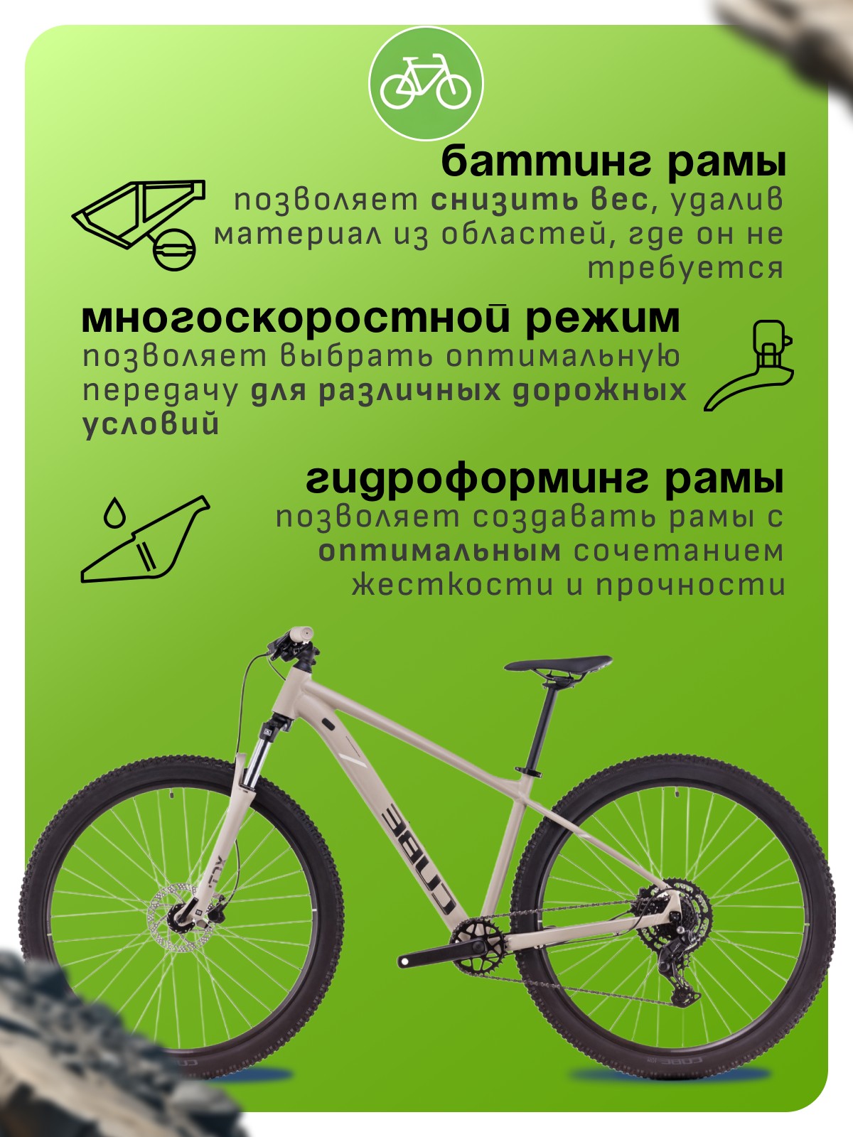 Особенности велосипеда: Алюминиевая рама, Амортизационная вилка, Баттинг рамы, Гидравлический привод тормозов, Гидроформинг рамы, Двойные обода, Дисковые тормоза, Многоскоростной.