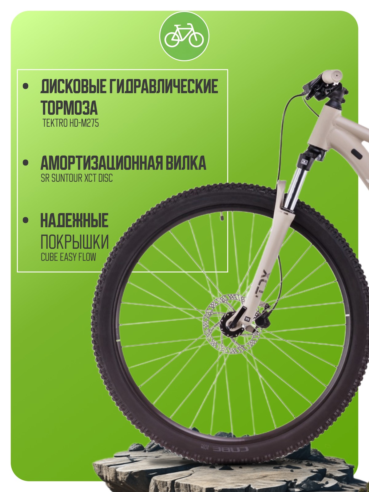 Легкий хардтейл для езды в стиле кросс-кантри с оборудованием высшего любительского класса Shimano, 9 скоростей. Технические особенности: алюминиевая рама Aluminium Lite (двойной баттинг, гидроформинг, скрытая проводка, сглаженные швы, крепление для подножки), амортизационная вилка SR Suntour XCT Disc (пружинно-эластомерная, регулировка преднагрузки, ход 100 мм), двойные алюминиевые обода CUBE EX25, дисковые гидравлические тормоза Tektro HD-M275 (роторы 160/160 мм). Подходит для активной езды по различным дорогам и пересеченной местности. Диаметр колес - 27,5 дюймов. Вес - 14,3 кг.