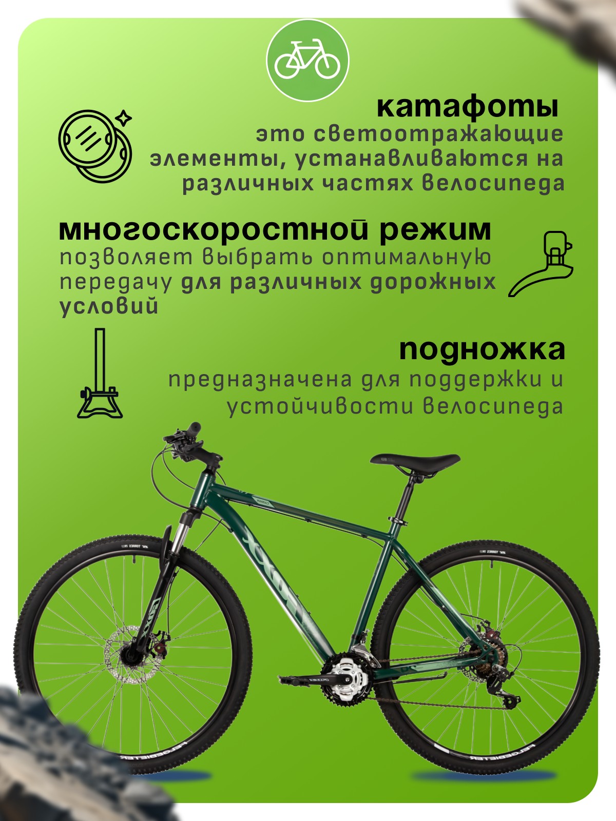 Особенности велосипеда: Амортизационная вилка, Двойные обода, Дисковые тормоза, Катафоты, Многоскоростной, Подножка.