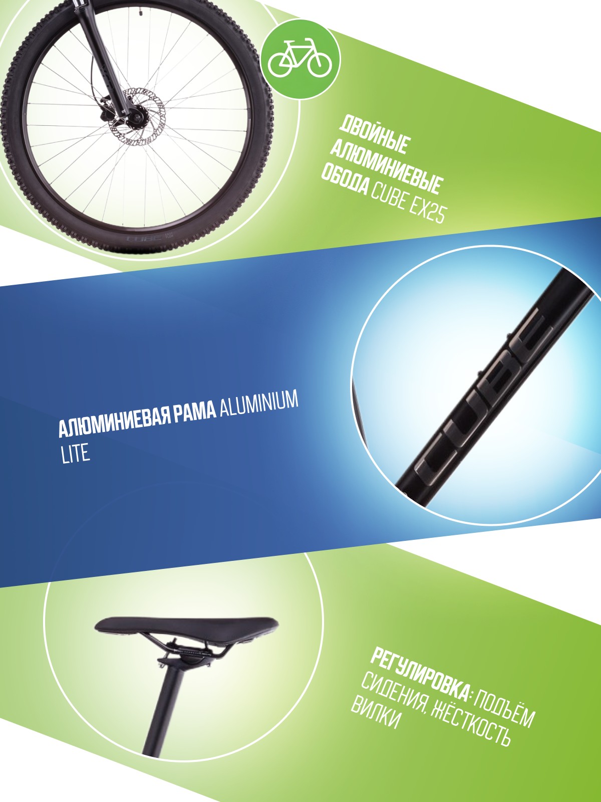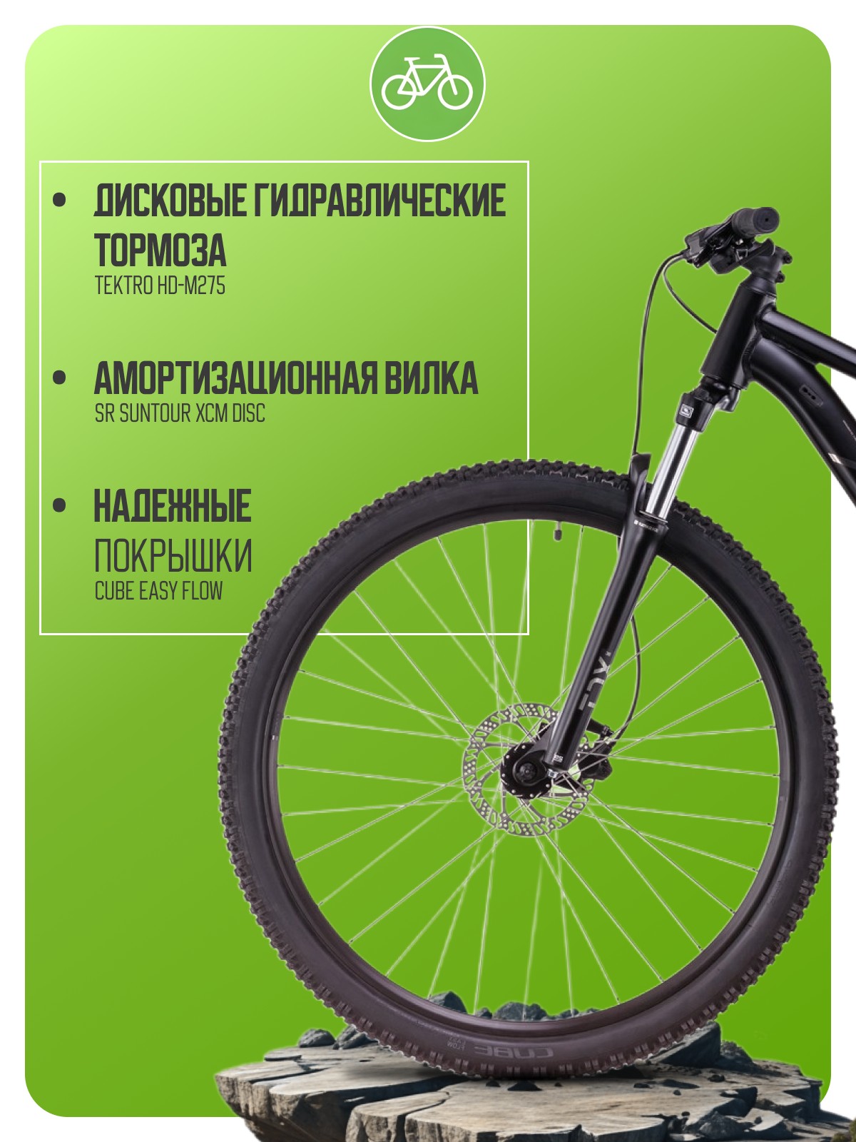 Легкий хардтейл для езды в стиле кросс-кантри с оборудованием высшего любительского класса Shimano, 9 скоростей. Технические особенности: алюминиевая рама Aluminium Lite (двойной баттинг, гидроформинг, скрытая проводка, сглаженные швы, крепление для подножки), амортизационная вилка SR Suntour XCT Disc (пружинно-эластомерная, ход 100 мм), двойные алюминиевые обода CUBE EX25, дисковые гидравлические тормоза Tektro HD-M275 (роторы 160/160 мм). Подходит для активной езды по различным дорогам и пересеченной местности. Диаметр колес - 29 дюймов. Вес - 14,3 кг.
