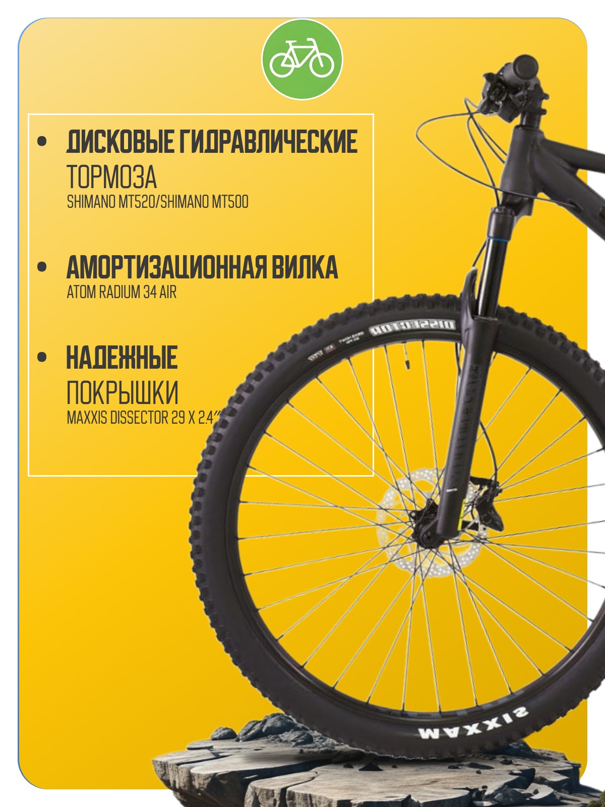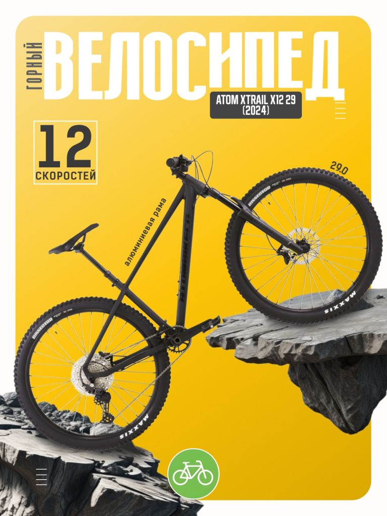 Горный велосипед с навесным оборудованием предпрофессионального класса Shimano, 12 скоростей. Технические особенности: алюминиевая рама Alloy 6061-T6 Triple Butted (тройной баттинг, внутренняя проводка, дропауты под полую ось), амортизационная вилка ATOM RADIUM 34 Air (воздушная, ход 120 мм, гидравлическая блокировка), двойные алюминиевые обода WTB STX i30, дисковые гидравлические тормоза Shimano MT520/Shimano MT500 (роторы Shimano RT30 180/180 мм). Подходит для активного катания в стиле трейл и кросс-кантри. Диаметр колес - 29 дюймов. Вес - 14,7 кг.