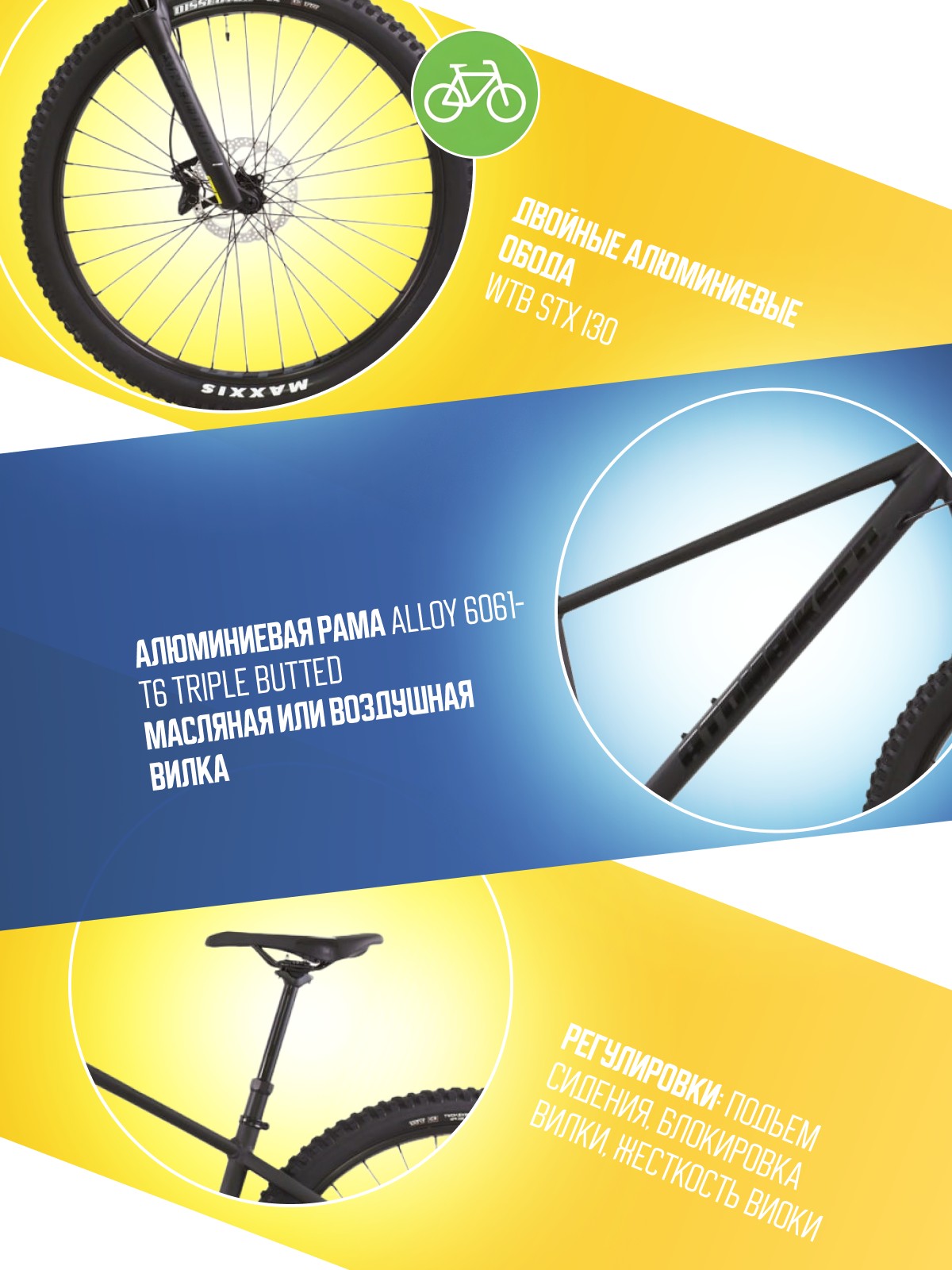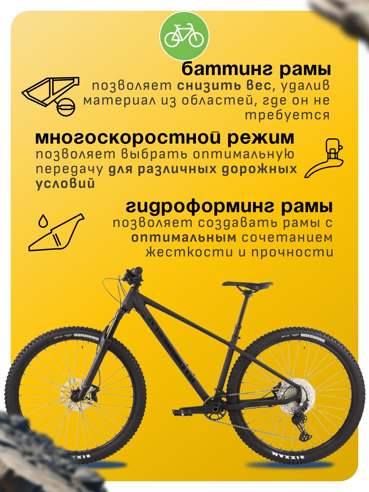 Особенности велосипеда: Алюминиевая рама, Амортизационная вилка, Баттинг рамы, Гидравлический привод тормозов, Гидроформинг рамы, Двойные обода, Дисковые тормоза, Масляная или воздушная вилка, Многоскоростной.