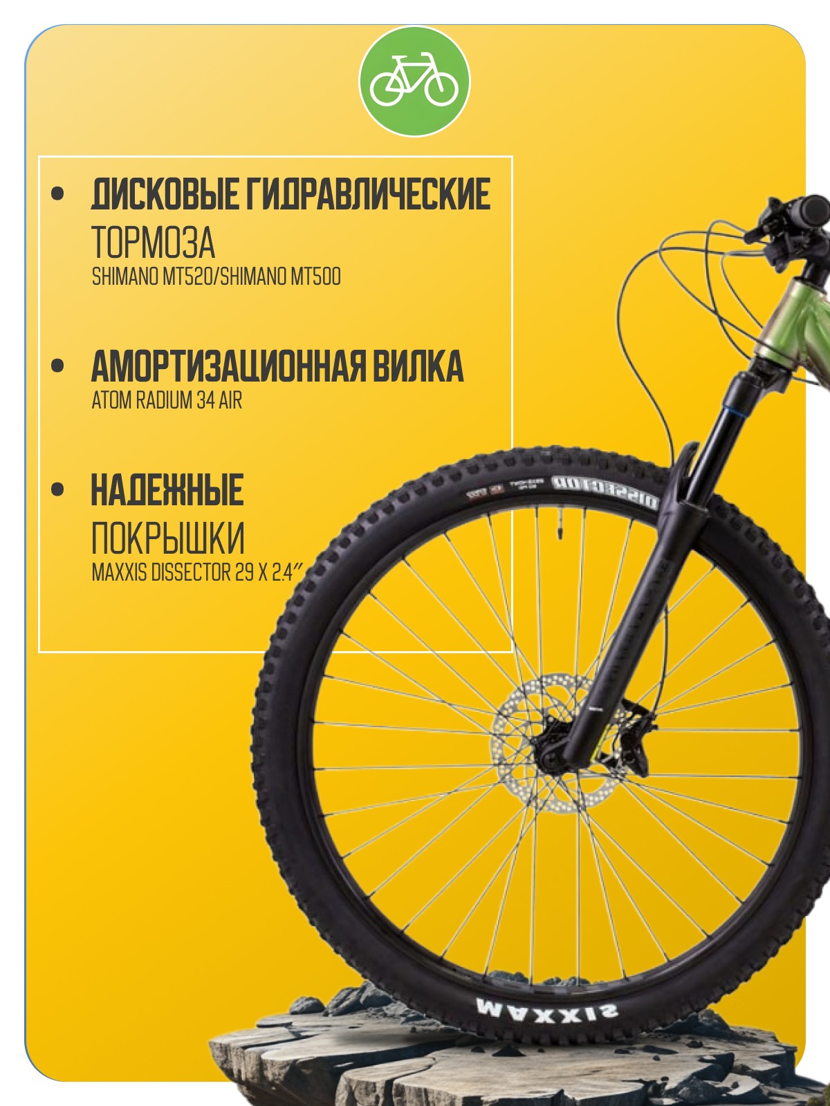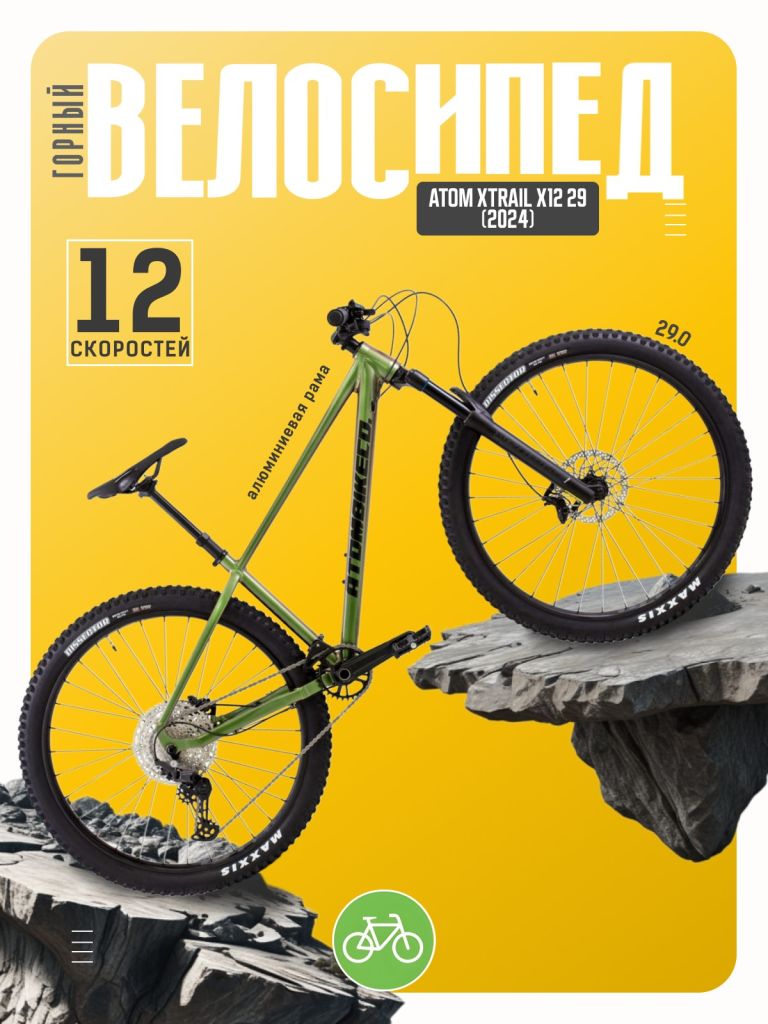 Горный велосипед с навесным оборудованием предпрофессионального класса Shimano, 12 скоростей. Технические особенности: алюминиевая рама Alloy 6061-T6 Triple Butted (тройной баттинг, внутренняя проводка, дропауты под полую ось), амортизационная вилка ATOM RADIUM 34 Air (воздушная, ход 120 мм, гидравлическая блокировка), двойные алюминиевые обода WTB STX i30, дисковые гидравлические тормоза Shimano MT520/Shimano MT500 (роторы Shimano RT30 180/180 мм). Подходит для активного катания в стиле трейл и кросс-кантри. Диаметр колес - 29 дюймов. Вес - 14,7 кг.