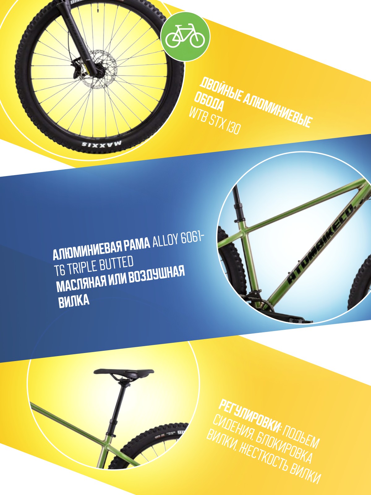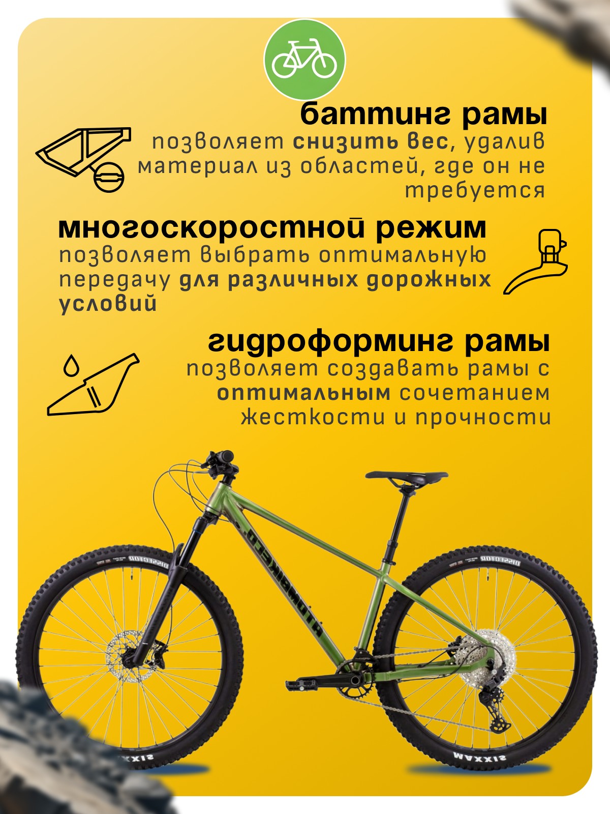Особенности велосипеда: Алюминиевая рама, Амортизационная вилка, Баттинг рамы, Гидравлический привод тормозов, Гидроформинг рамы, Двойные обода, Дисковые тормоза, Масляная или воздушная вилка, Многоскоростной.