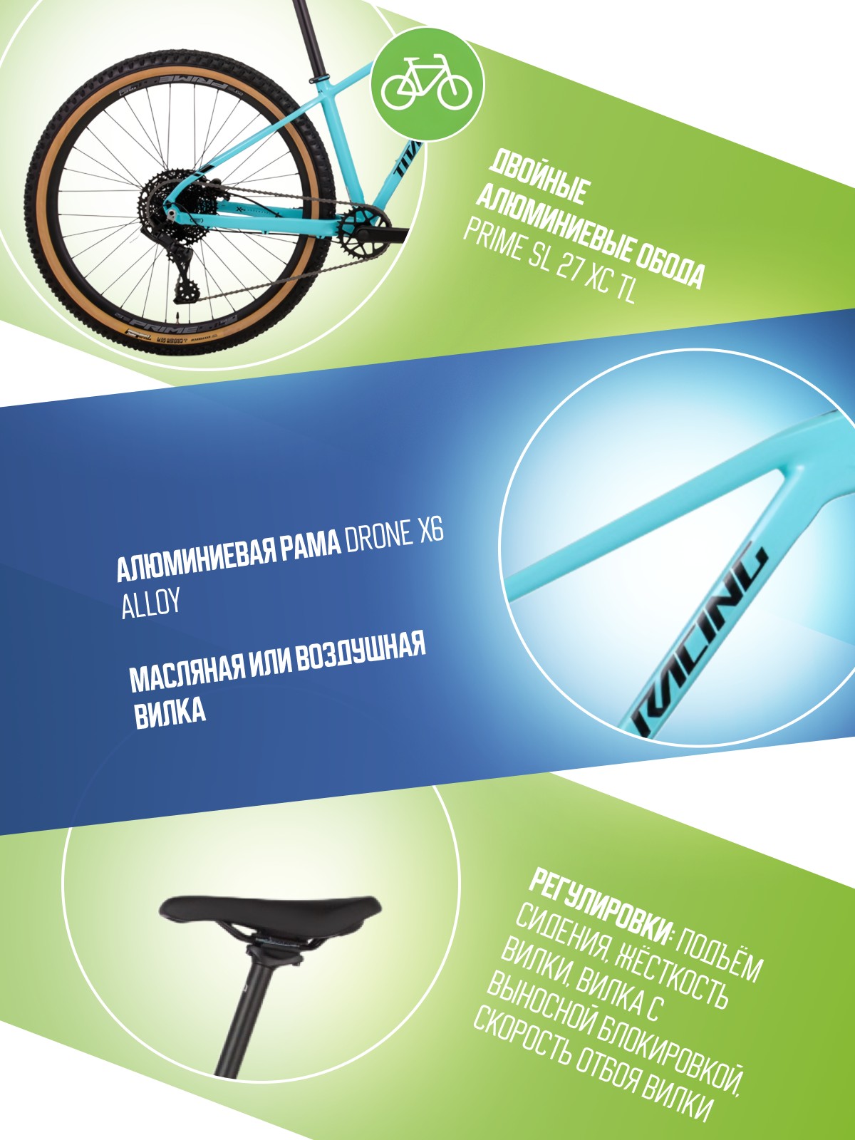 Регулировки и настройки: Вилка с выносной блокировкой, Жесткость вилки, Подьем сидения, Скорость отбоя вилки.