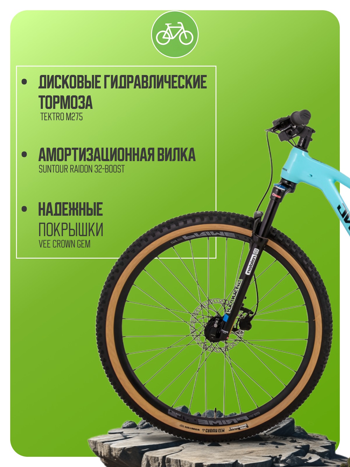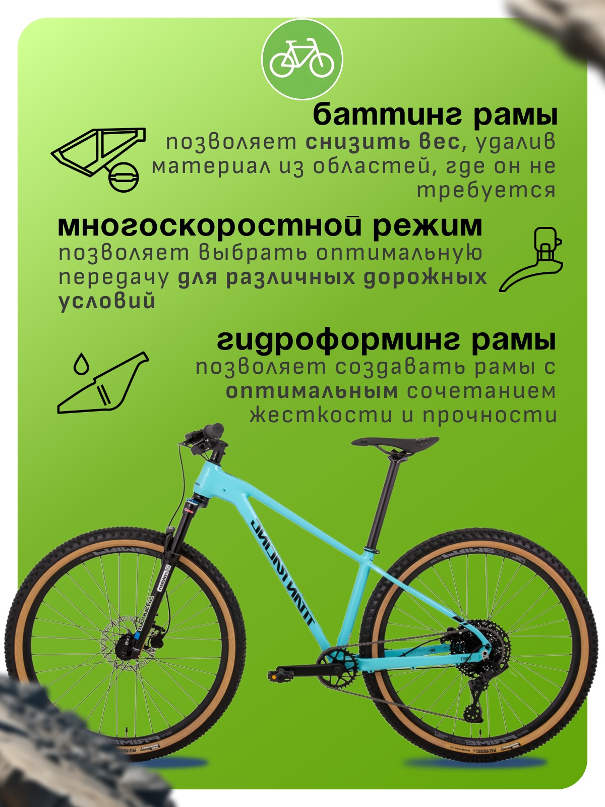 Особенности велосипеда: Алюминиевая рама, Амортизационная вилка, Баттинг рамы, Гидравлический привод тормозов, Гидроформинг рамы, Двойные обода, Дисковые тормоза, Масляная или воздушная вилка, Многоскоростной.
