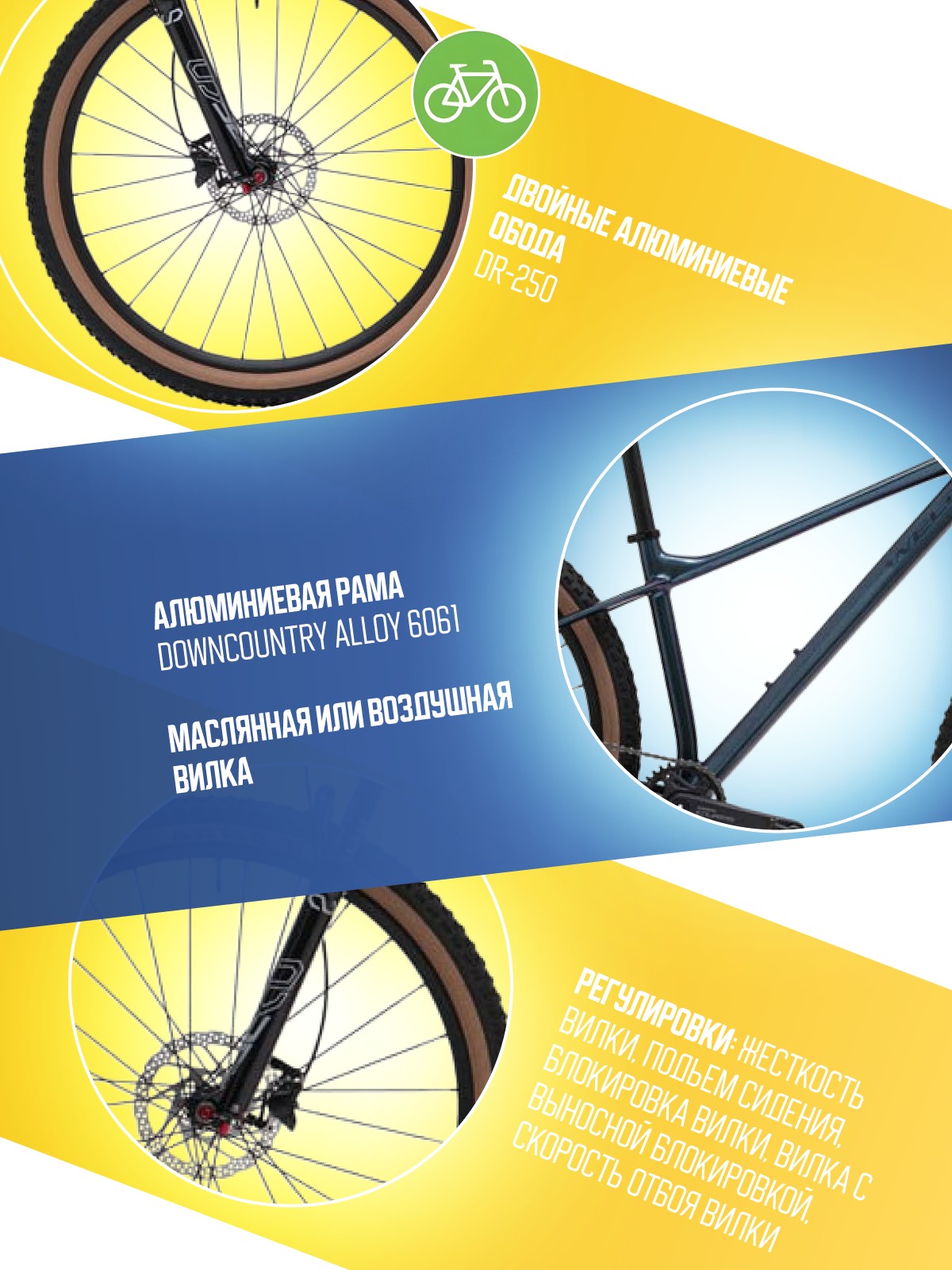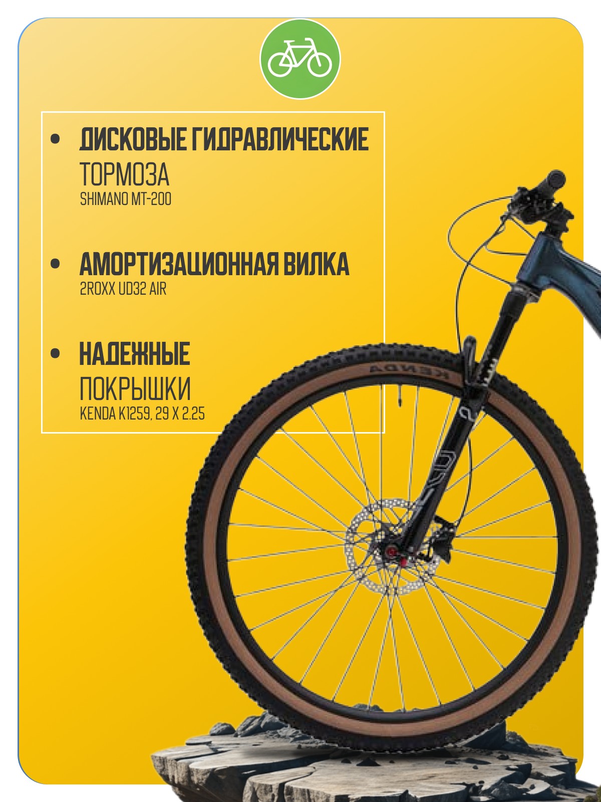 Легкий хардтейл для езды в стиле кросс-кантри/трейл, с оборудованием предпрофессионального класса Shimano, 11 скоростей. Технические особенности: алюминиевая рама Downcountry Alloy 6061 (внутренняя проводка, гидроформинг, баттинг, сглаженные швы, дропауты под полую ось Boost), амортизационная вилка 2ROXX UD32 Air (масляно-воздушная, ход 120 мм, блокировка хода вилки, регулировка жесткости пружины вилки, регулировка скорости обратного хода вилки), двойные алюминиевые обода DR-250 (подходят для бескамерного использования), дисковые гидравлические тормоза Shimano MT-200. Подходит для активного катания по пересеченной местности и в стиле кросс-кантри/трейл. Диаметр колес - 29 дюймов. Вес - 13 кг.