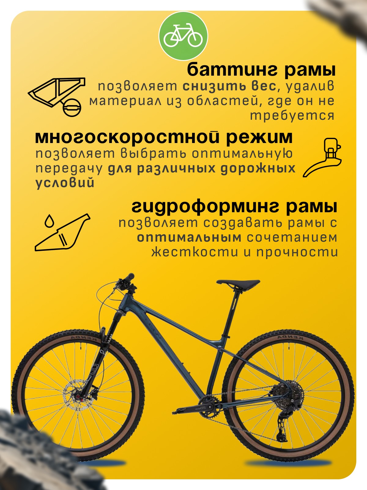 Особенности велосипеда: Алюминиевая рама, Амортизационная вилка, Баттинг рамы, Гидравлический привод тормозов, Гидроформинг рамы, Двойные обода, Дисковые тормоза, Масляная или воздушная вилка, Многоскоростной.