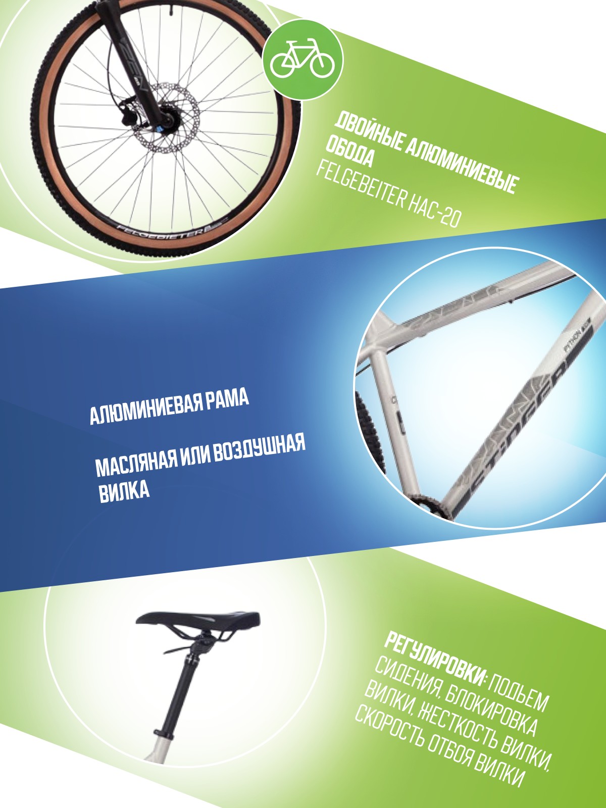 Регулировки и настройки: Блокировка вилки, Жесткость вилки, Подьем сидения, Скорость отбоя вилки.