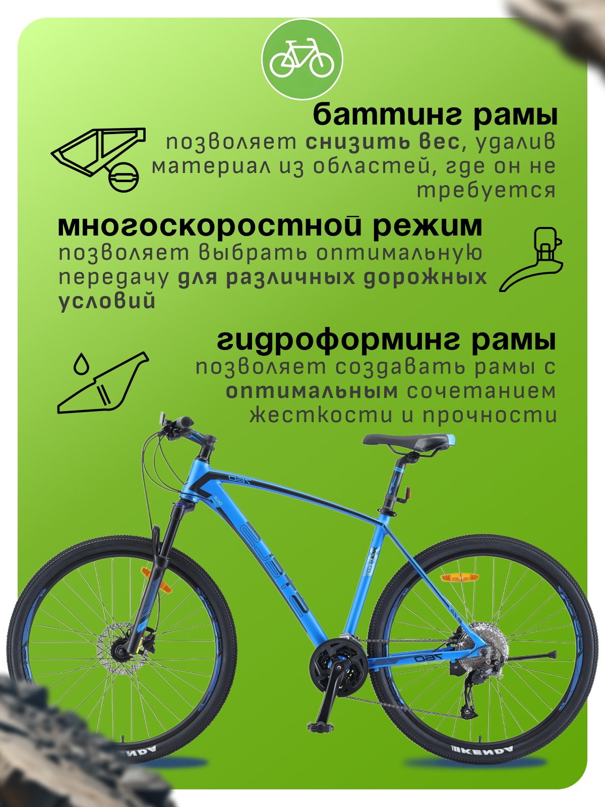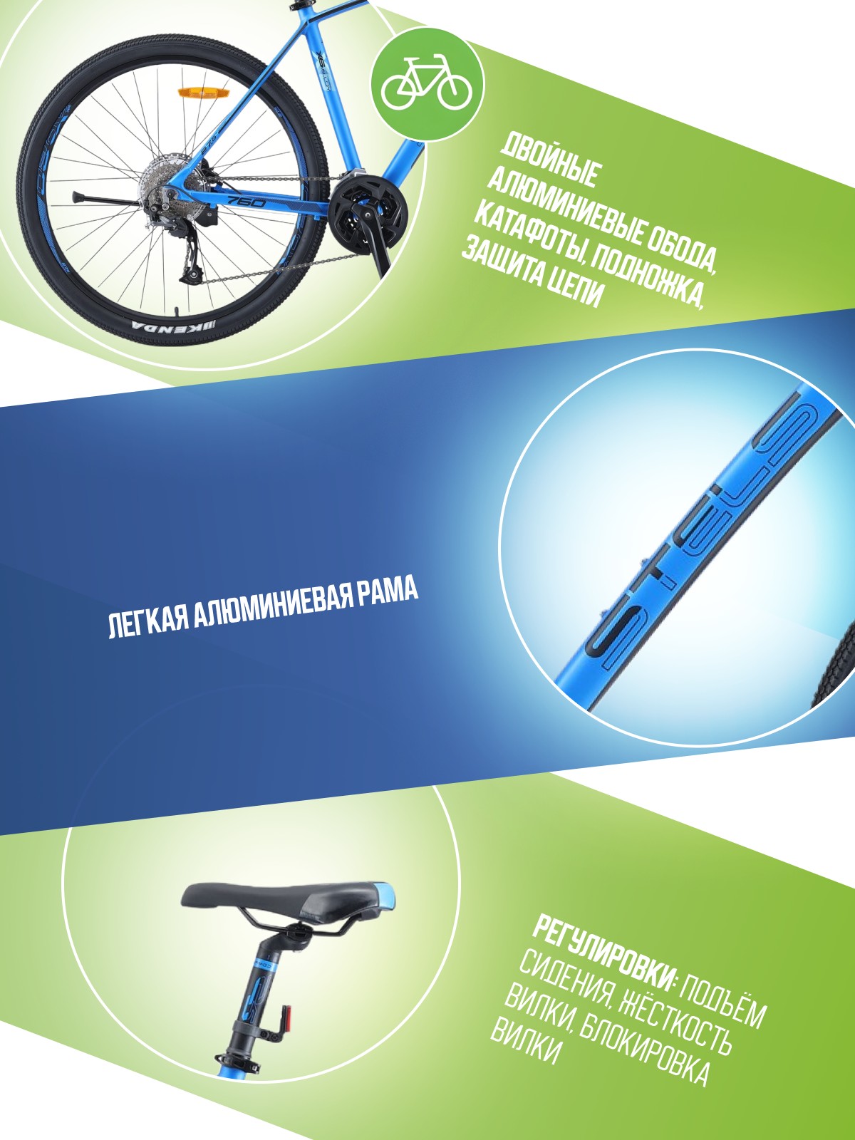 Особенности велосипеда: Алюминиевая рама, Амортизационная вилка, Баттинг рамы, Гидроформинг рамы, Двойные обода, Дисковые тормоза, Защита цепи, Катафоты, Многоскоростной, Подножка, Гидравлический привод тормозов.