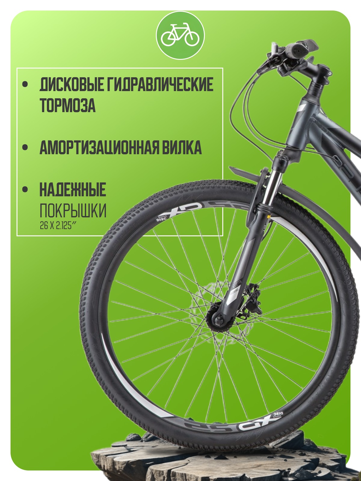 Горный велосипед для начинающих с навесным оборудованием Shimano, 21 скорость. Технические особенности: легкая алюминиевая рама (частично скрытая проводка, съемный петух, кареточный стакан BSA, крепление калипера IS), амортизационная вилка (пружинно-эластомерная, стальная с алюминиевой короной, ход 60 мм, крепление калипера IS), двойные алюминиевые обода (под AV ниппель), дисковые гидравлические тормоза (роторы 160/160 мм с креплением на 6 болтов), катафоты. Подходит для прогулочной езды по различным дорогам и пересеченной местности. Диаметр колес - 26 дюймов. Вес - 15,68 кг.