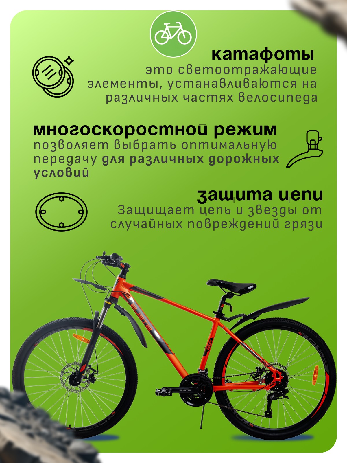 Особенности велосипеда: Алюминиевая рама, Амортизационная вилка, Гидравлический привод тормозов, Двойные обода, Дисковые тормоза, Защита цепи, Катафоты, Крылья, Многоскоростной, Подножка.