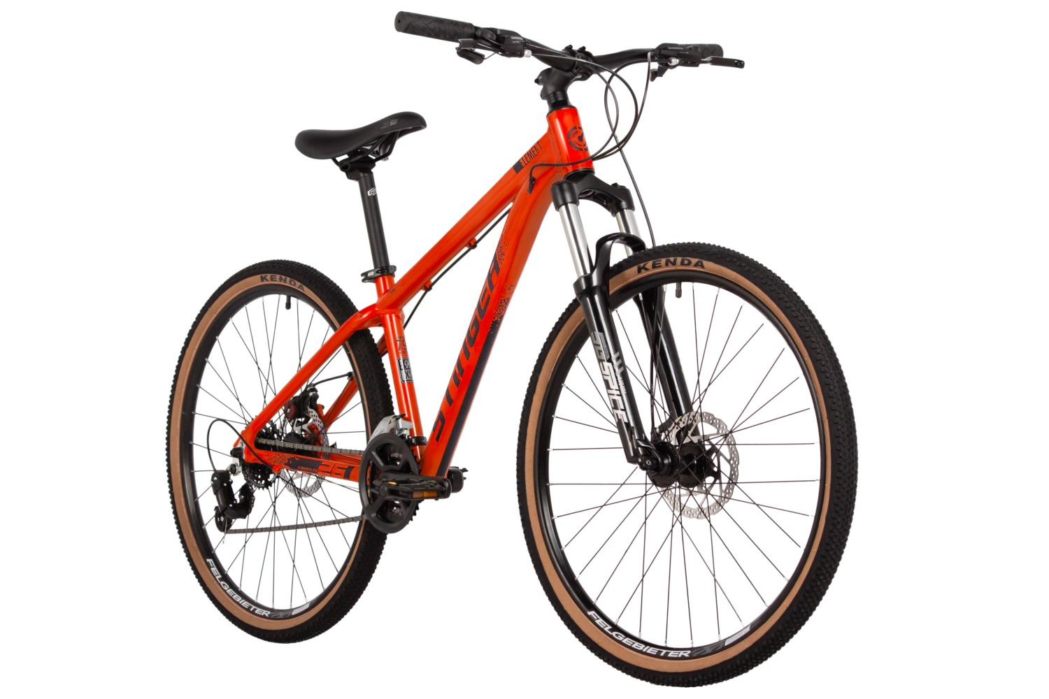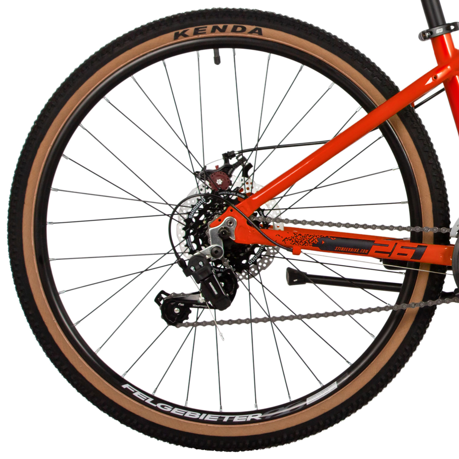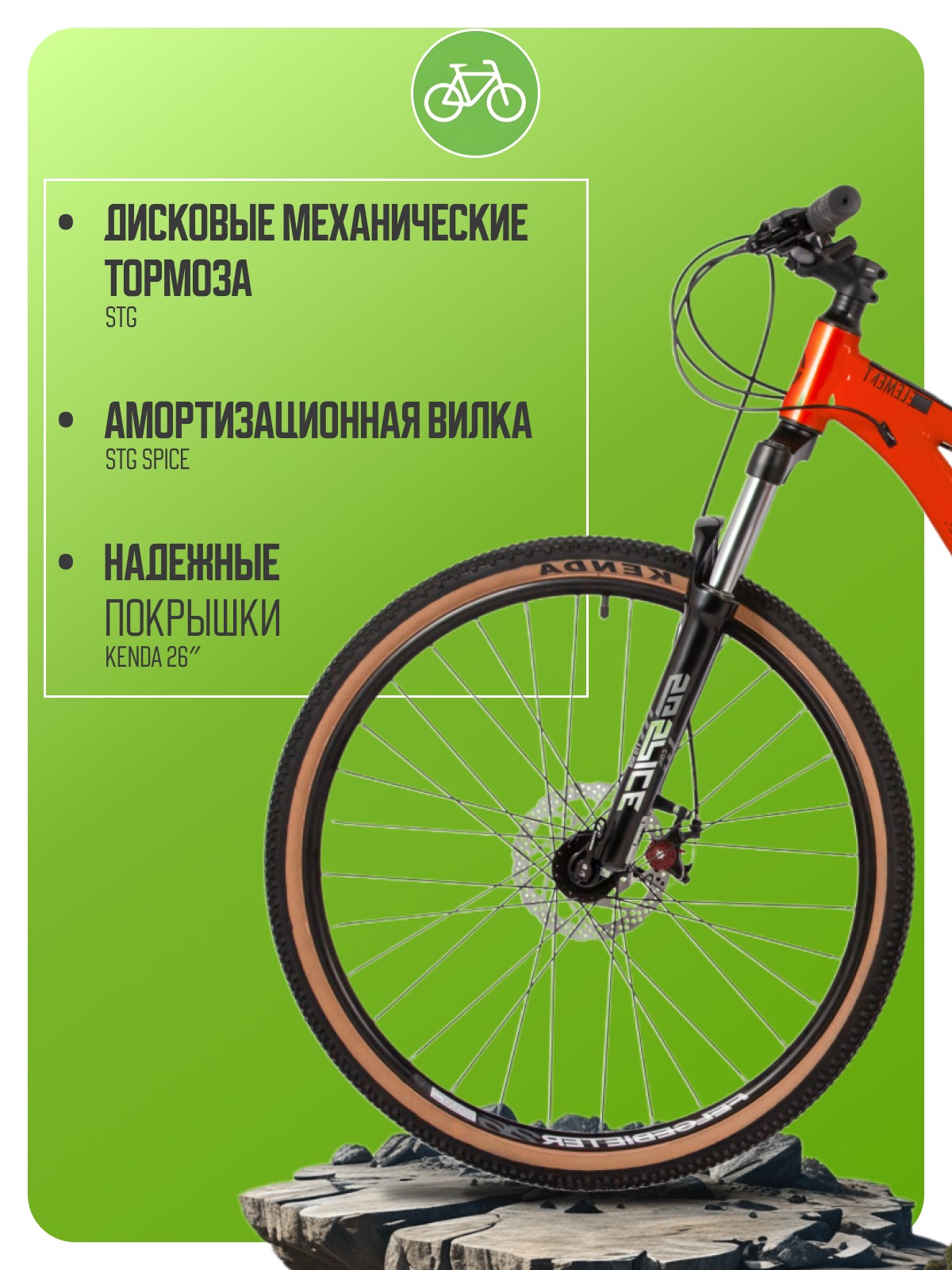 Горный велосипед с оборудованием начального класса Shimano, 14 скоростей. Технические особенности: легкая алюминиевая рама (сплав 6061-T6, полуинтегрированная рулевая колонка, кареточный стакан BSA, частично скрытая прокладка тросов, съёмный петух), амортизационная вилка STG Spice (пружинная, ход 110 мм, регулировка преднатяга пружины), двойные алюминиевые обода Felgebeiter VB-18 (под AV ниппель), дисковые механические тормоза STG (роторы 160/160 мм с креплением на 6 болтов), защита цепи, подножка. Подходит для активной езды по различным дорогам и пересеченной местности. Диаметр колес - 26 дюймов. Вес - 15 кг.
