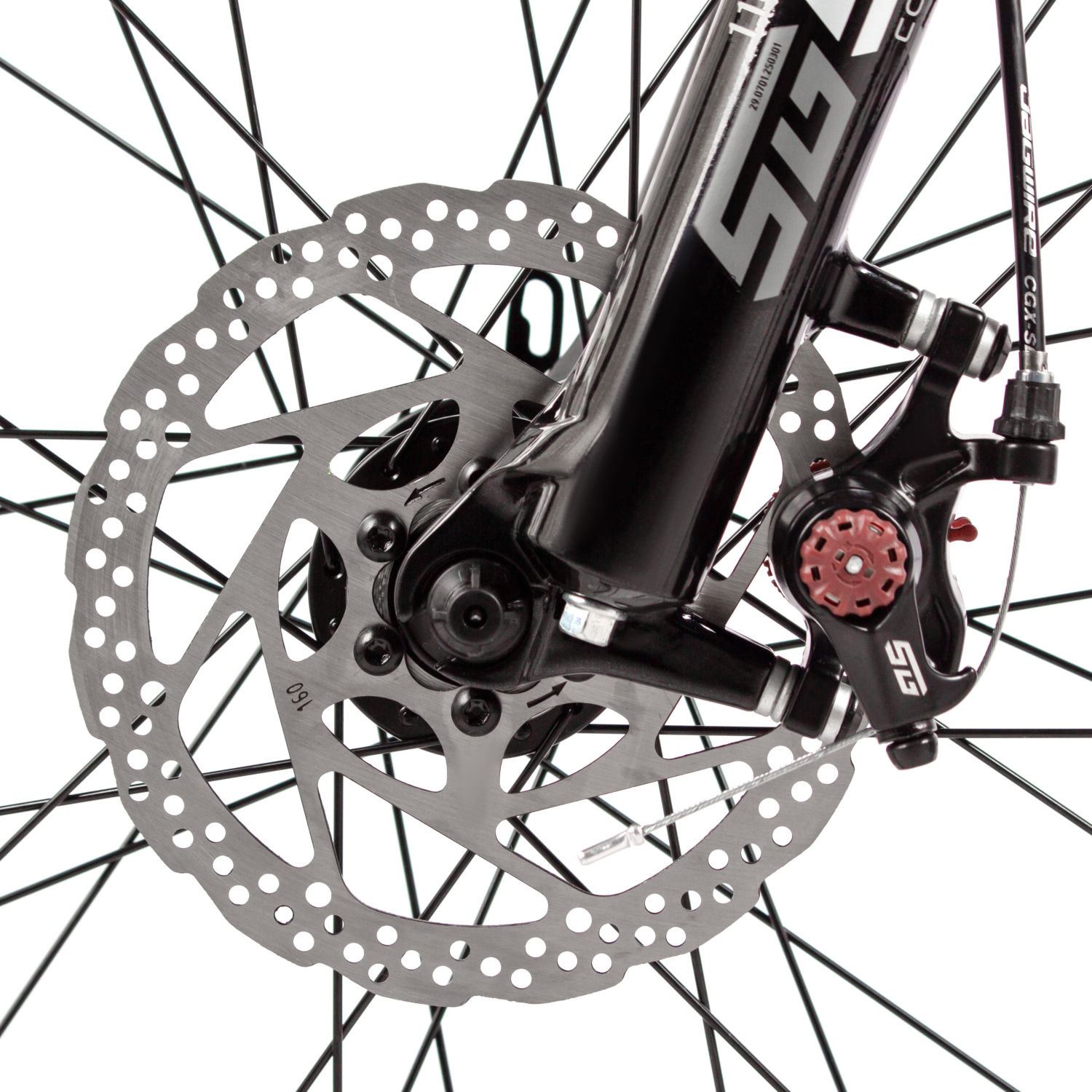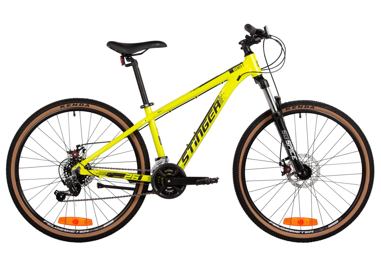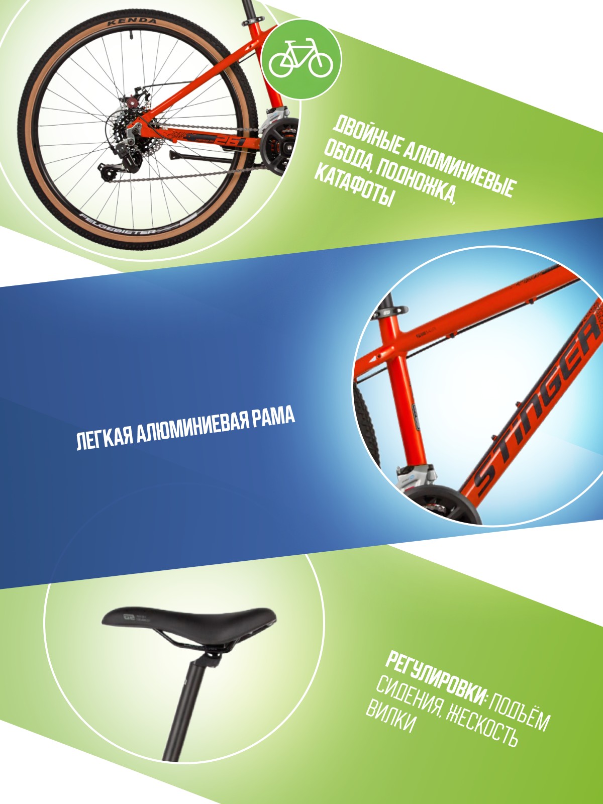 Горный велосипед с оборудованием начального класса Shimano, 14 скоростей. Технические особенности: легкая алюминиевая рама (сплав 6061-T6, полуинтегрированная рулевая колонка, кареточный стакан BSA, частично скрытая прокладка тросов, съёмный петух), амортизационная вилка STG Spice (пружинная, ход 110 мм, регулировка преднатяга пружины), двойные алюминиевые обода Felgebeiter VB-18 (под AV ниппель), дисковые механические тормоза STG (роторы 160/160 мм с креплением на 6 болтов), защита цепи, подножка. Подходит для активной езды по различным дорогам и пересеченной местности. Диаметр колес - 26 дюймов. Вес - 15 кг.