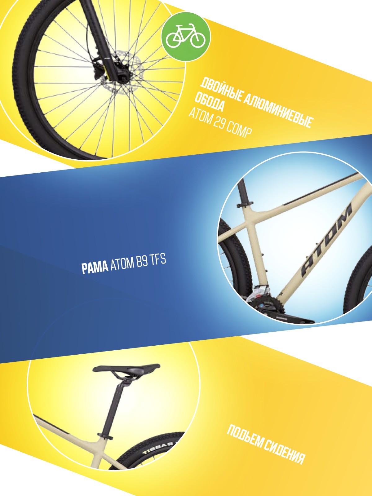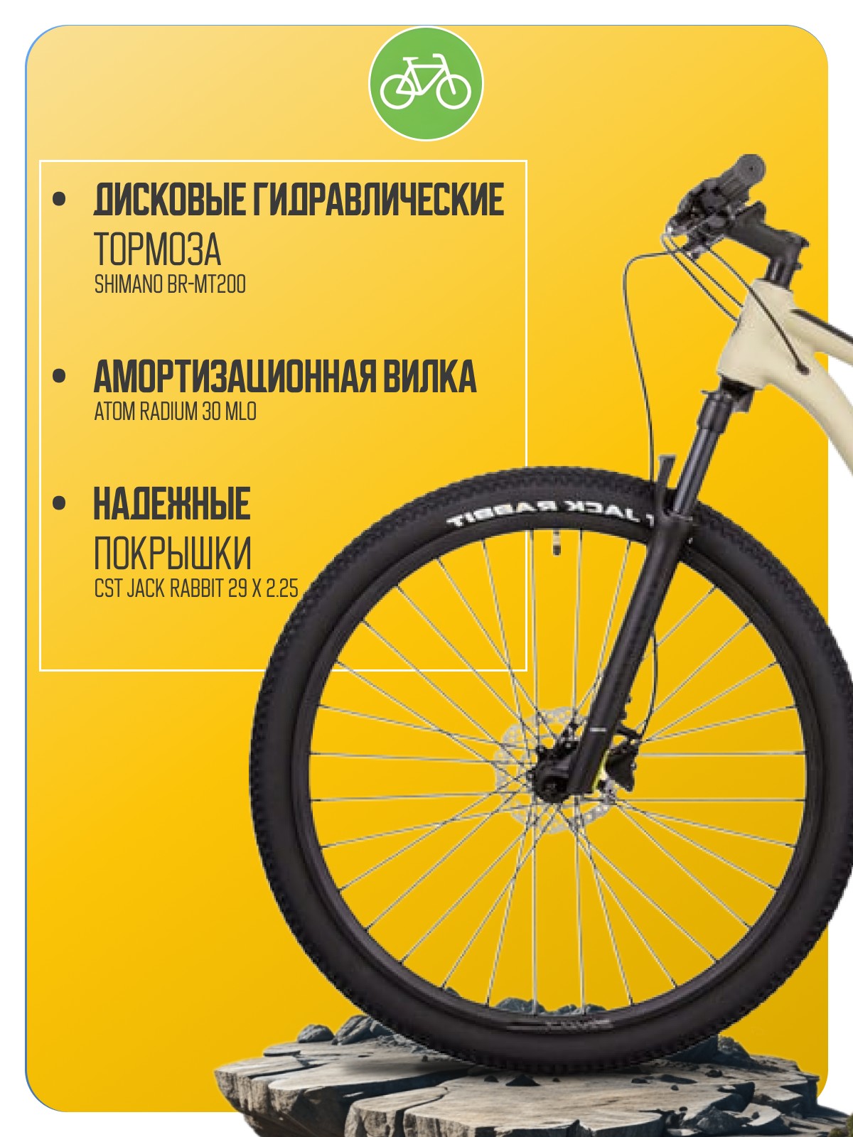 Горный велосипед оборудованием предпрофессионального класса Shimano, 16 скоростей. Технические особенности: алюминиевая рама ATOM B9 TFS (тройной баттинг, внутренняя проводка), амортизационная вилка ATOM RADIUM 30 MLO (ход 100 мм), двойные алюминиевые обода ATOM 29 Comp, дисковые гидравлические тормоза Shimano BR-MT200. Подходит для активного катания в стиле трейл и кросс-кантри. Диаметр колес - 29 дюймов. Вес - 14.2 кг.