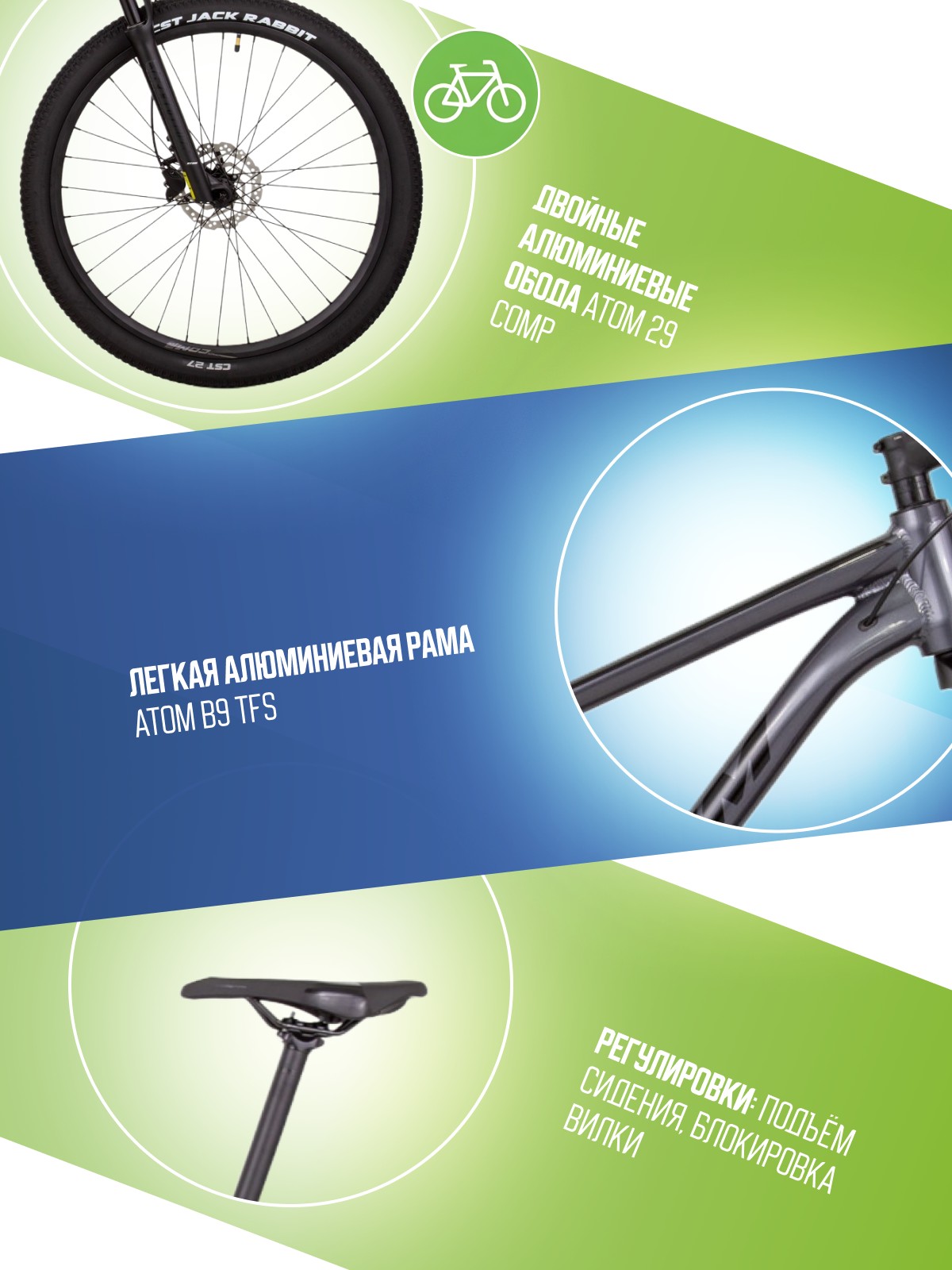 Горный велосипед оборудованием предпрофессионального класса Shimano, 16 скоростей. Технические особенности: алюминиевая рама ATOM B9 TFS (тройной баттинг, внутренняя проводка), амортизационная вилка ATOM RADIUM 30 MLO (ход 100 мм), двойные алюминиевые обода ATOM 29 Comp, дисковые гидравлические тормоза Shimano BR-MT200. Подходит для активного катания в стиле трейл и кросс-кантри. Диаметр колес - 29 дюймов. Вес - 14.2 кг.