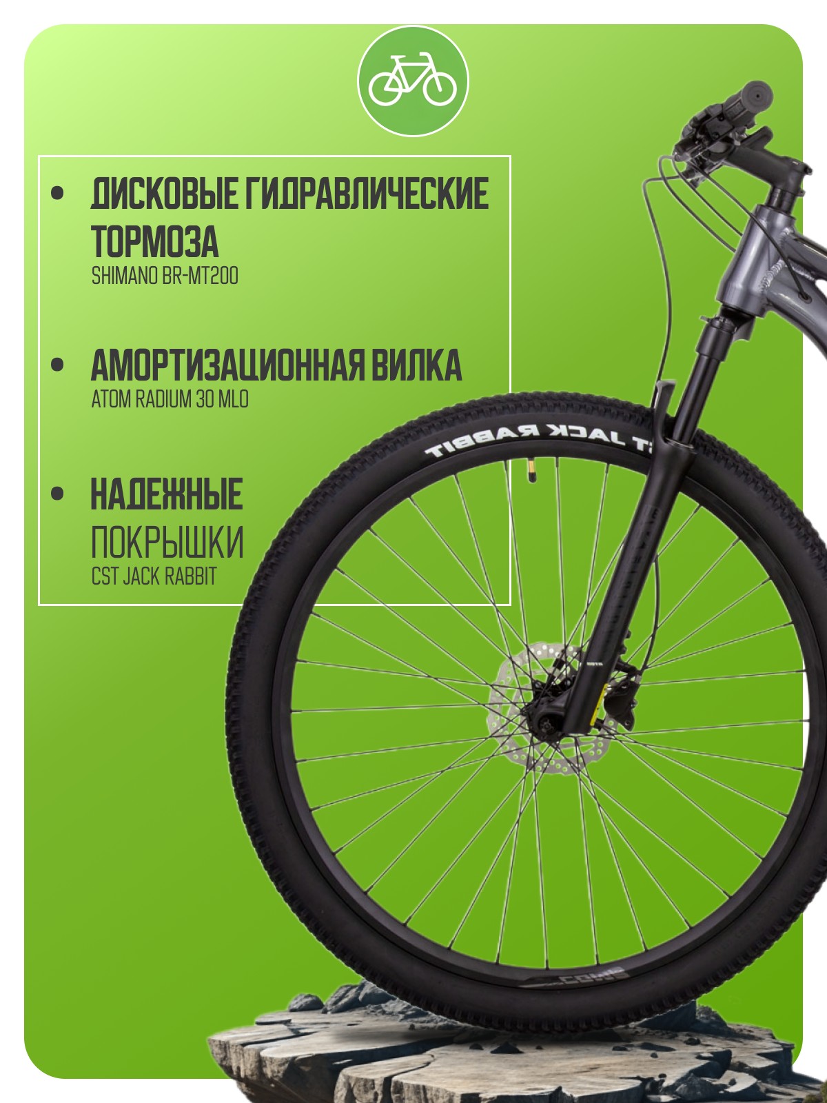 Особенности велосипеда: Алюминиевая рама, Амортизационная вилка, Гидравлический привод тормозов, Двойные обода, Дисковые тормоза, Многоскоростной.